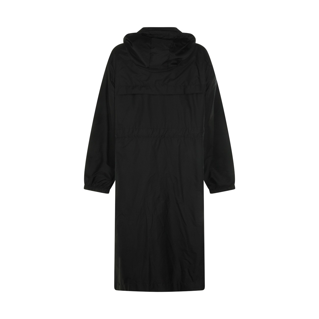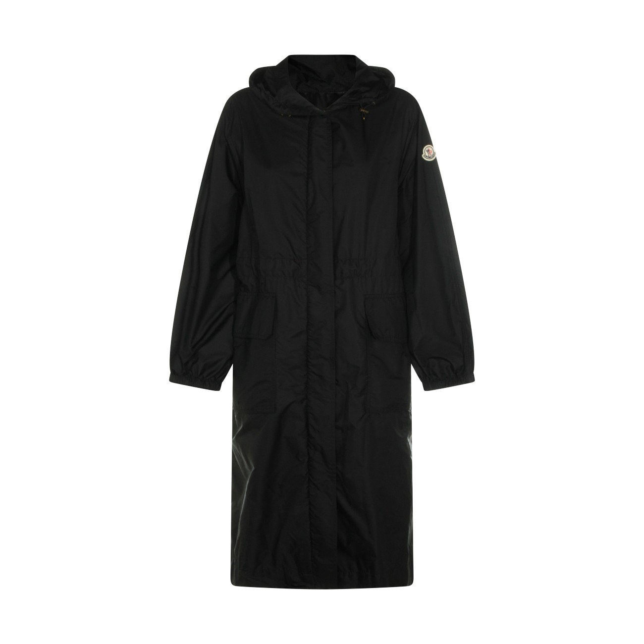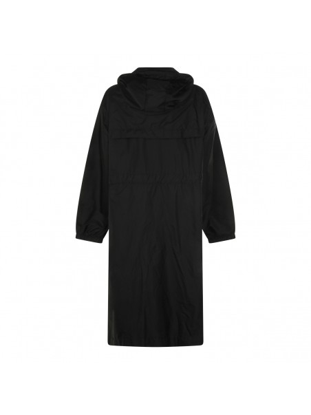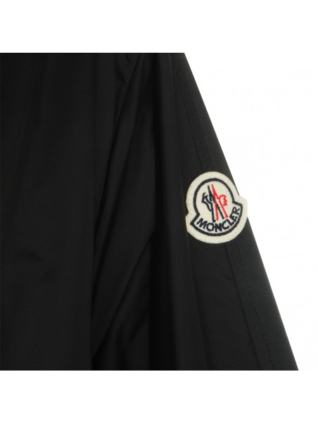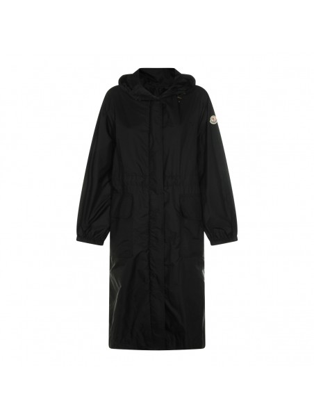 Black Hiengos casual jacket from Moncler featuring hood, long sleeves, logo patch, frontal closure, drawstring at waist and long lenght.