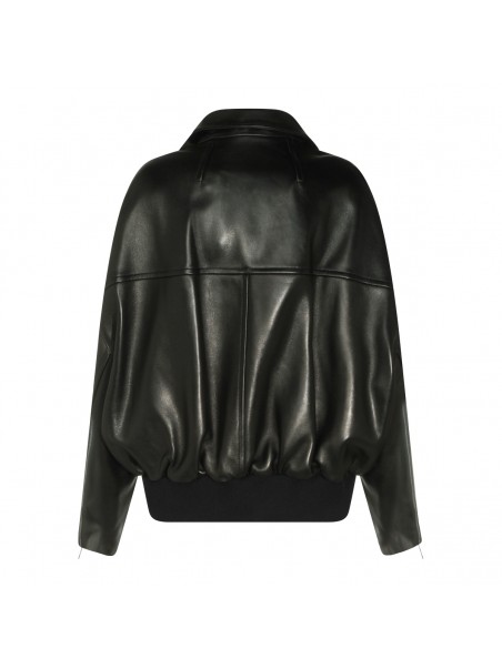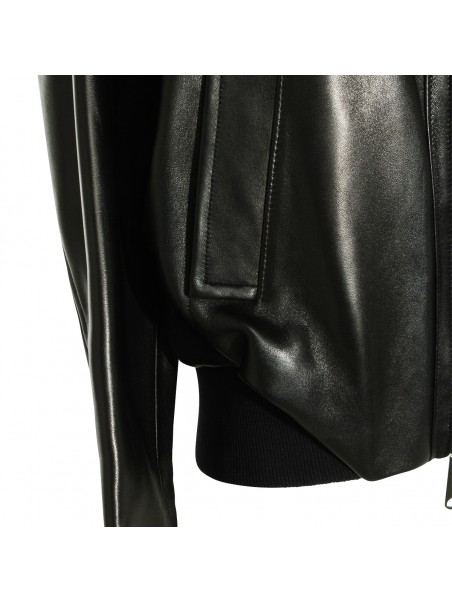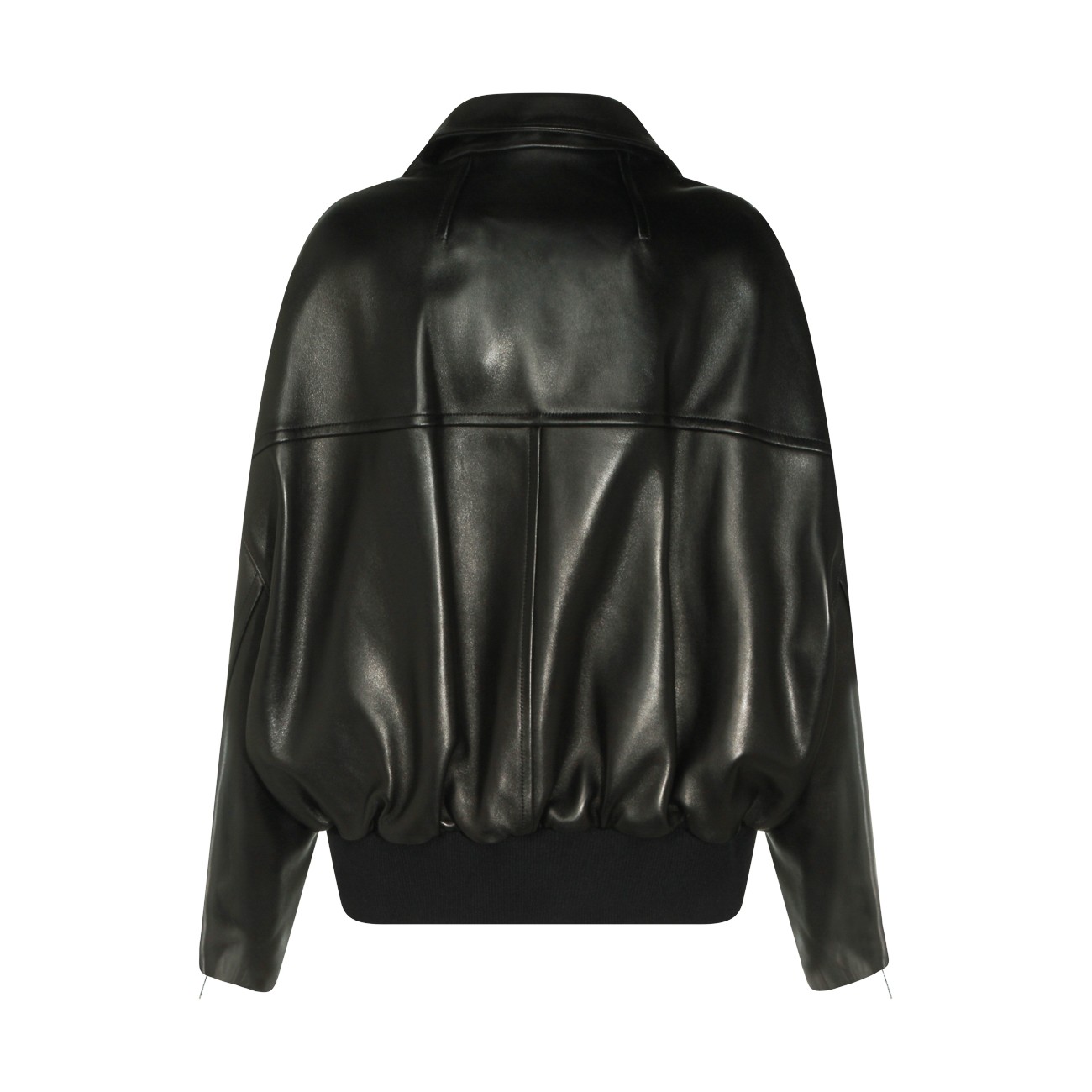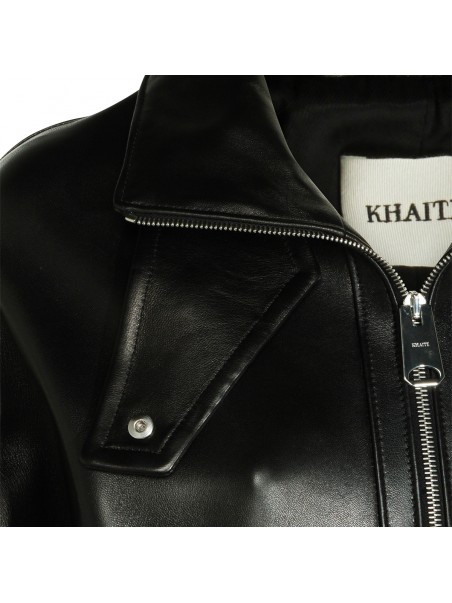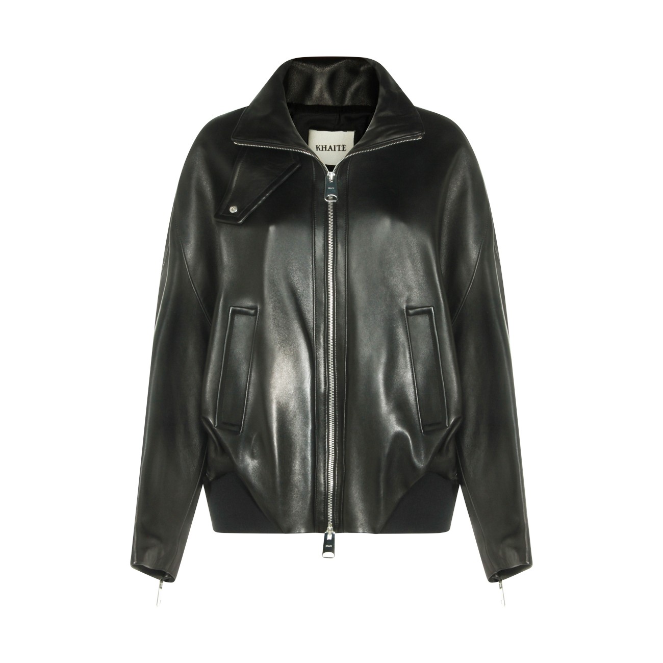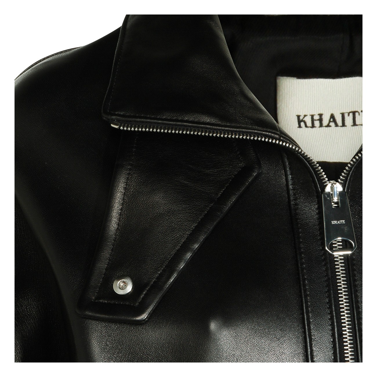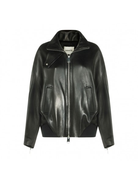 Black leather jacket from Khaite featuring stand collar, long sleeves, zip fastening, pockets and regular fit.
