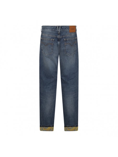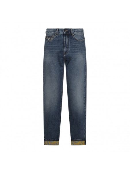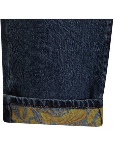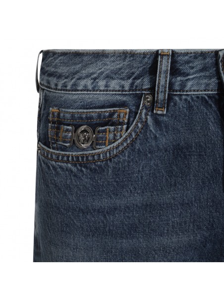 Indigo blue cotton jeans from Versace featuring frontal fastening, belt loops, pockets and regular vestibility.