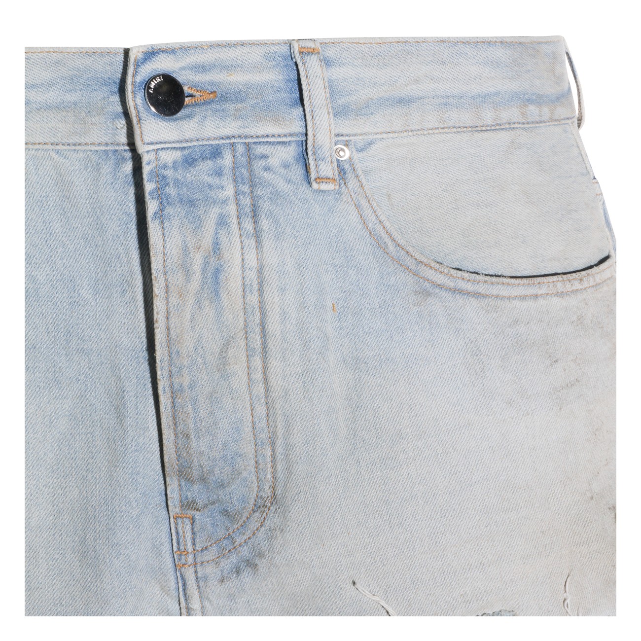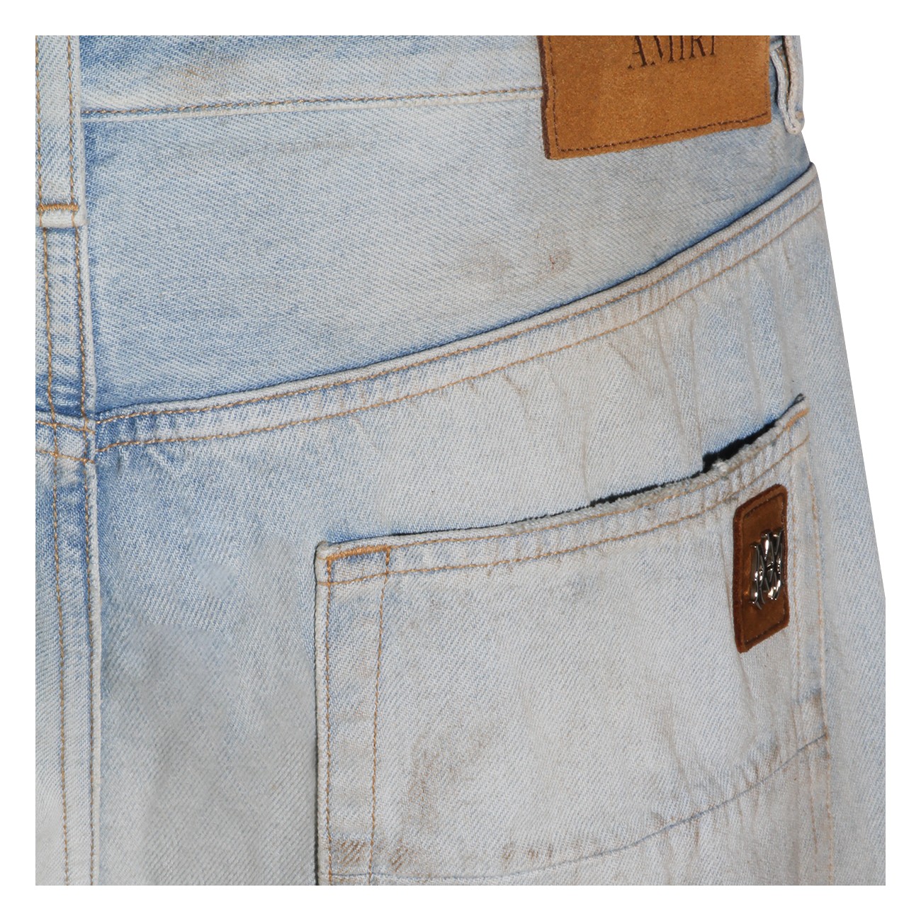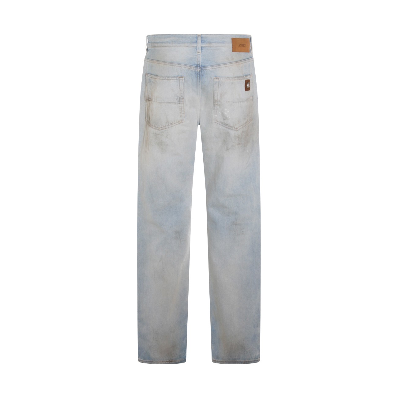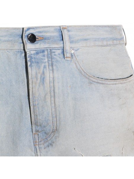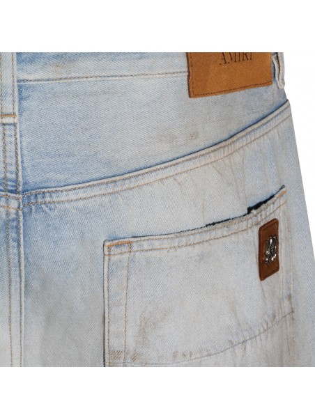 Light blue cotton denim jeans from Amiri featuring belt loops, zip and button closure, classic pockets, cut details, logo patch and regular fit.