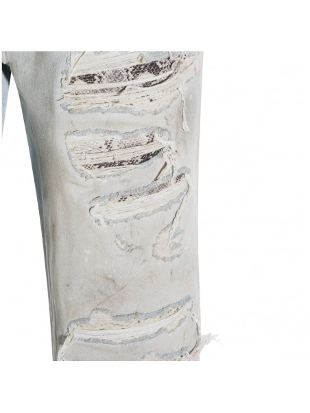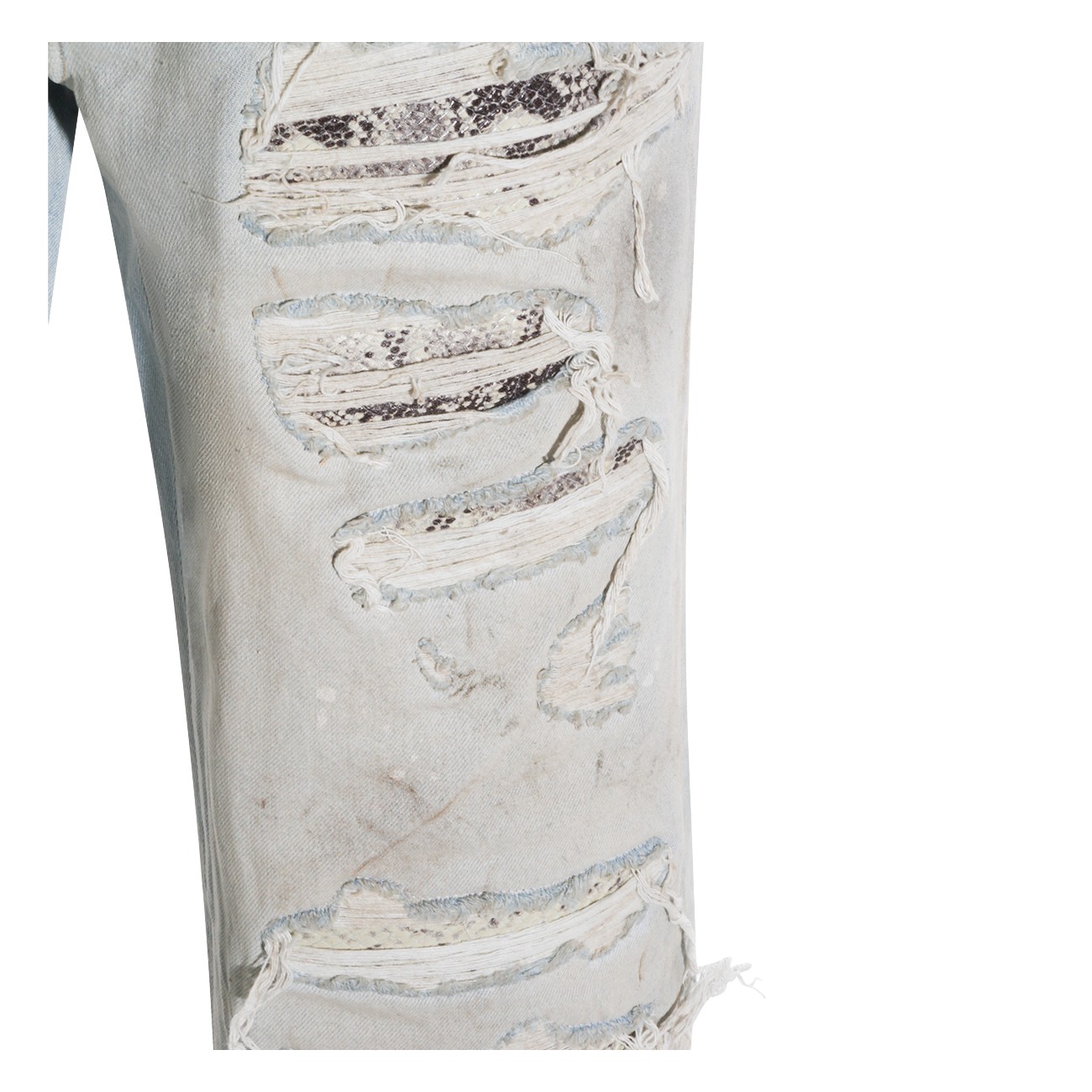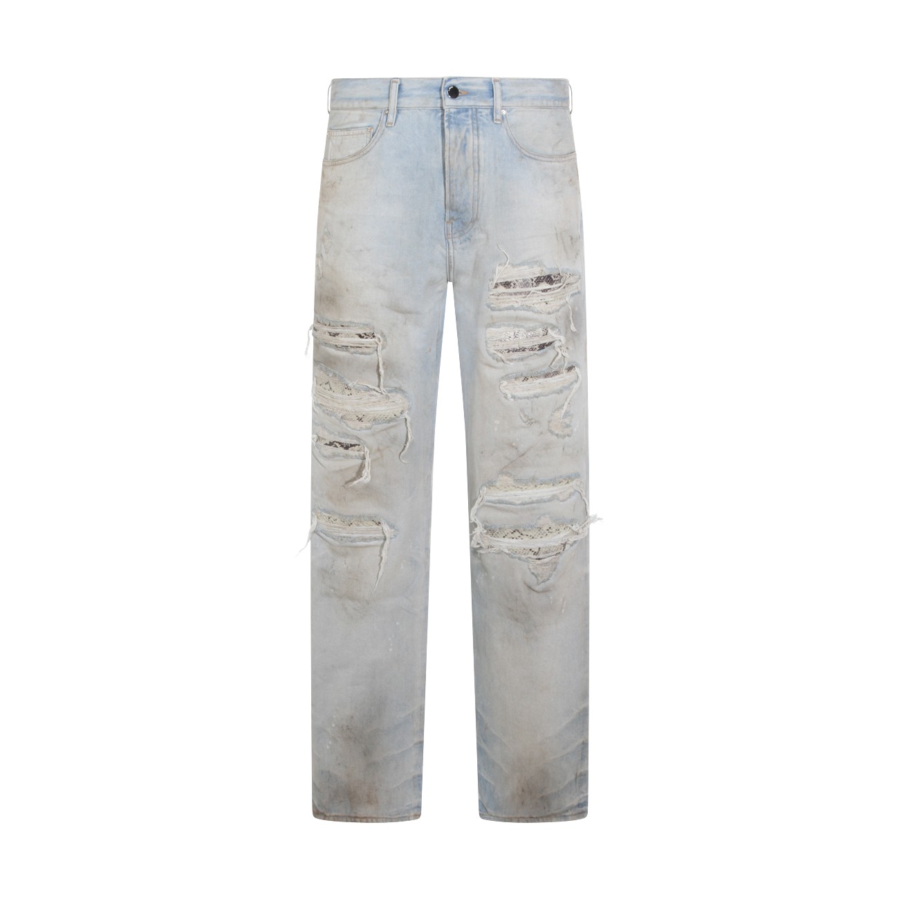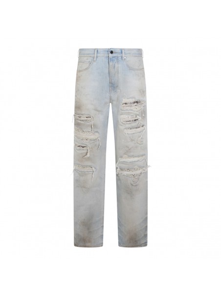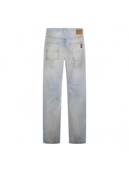 Light blue cotton denim jeans from Amiri featuring belt loops, zip and button closure, classic pockets, cut details, logo patch and regular fit.