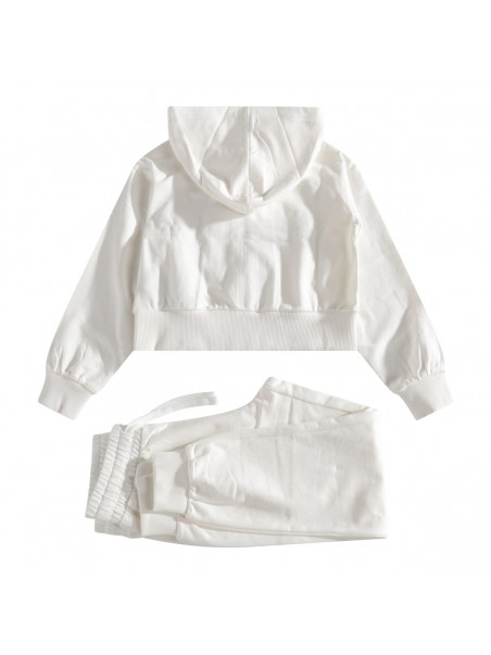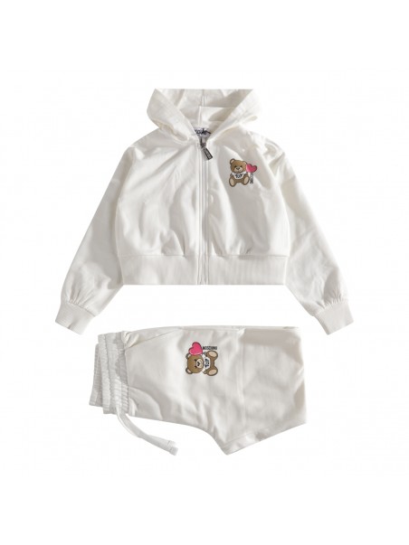 White cotton jumpsuits from Moschino featuring jumper with long sleeves, zip and hood and pants with logo and pockets.