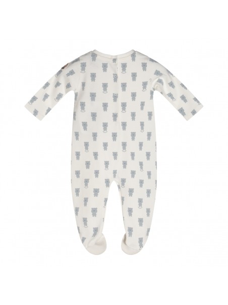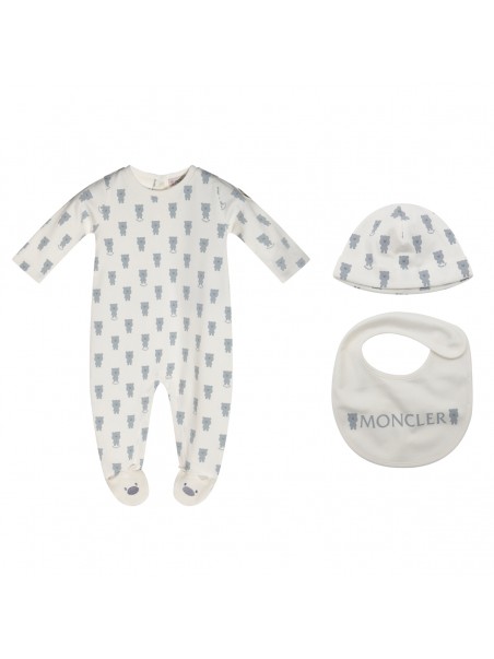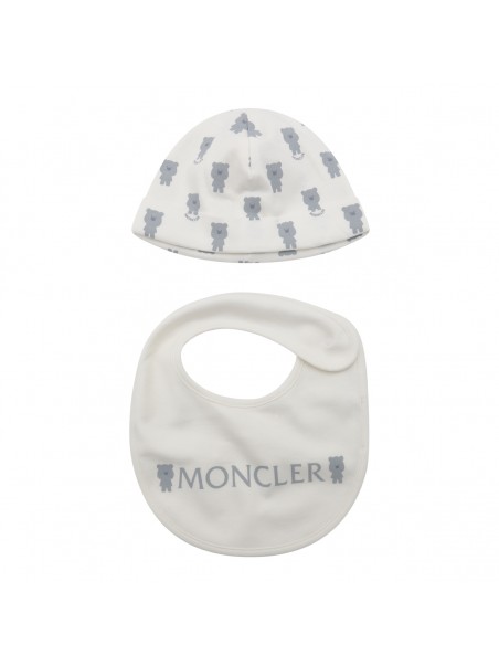 White and light blue jumpsuit from Moncler featuring long sleeves, round collar, button fastening, beanie and bib.