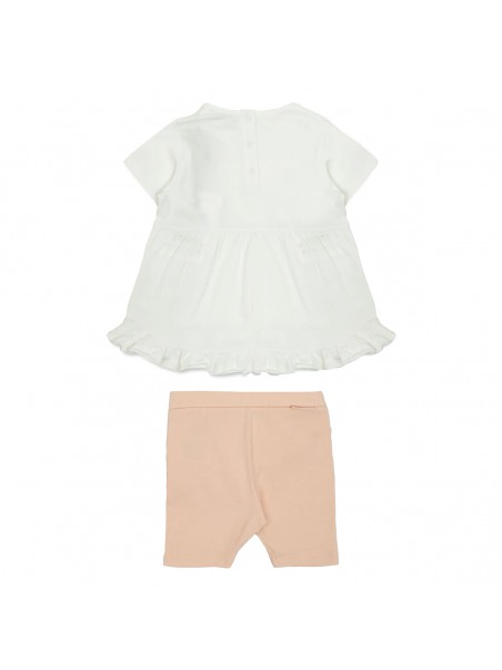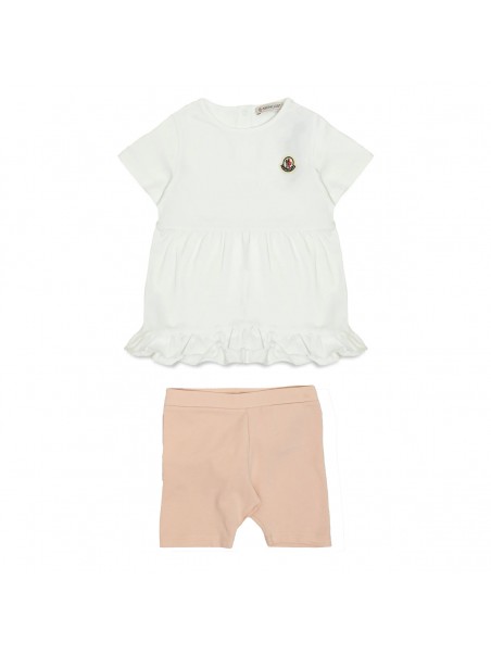White cotton jumpsuits from Moncler featuring two pieces, t-shirt with round collar, short sleeves and shorts.