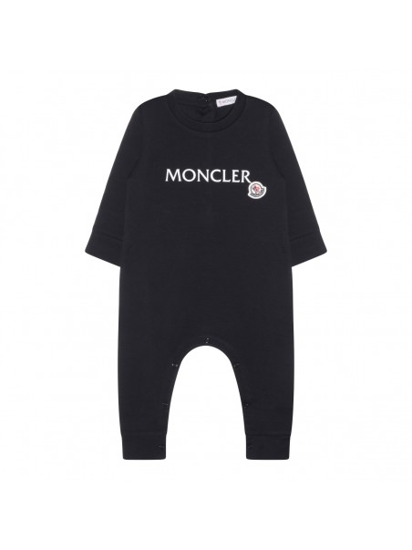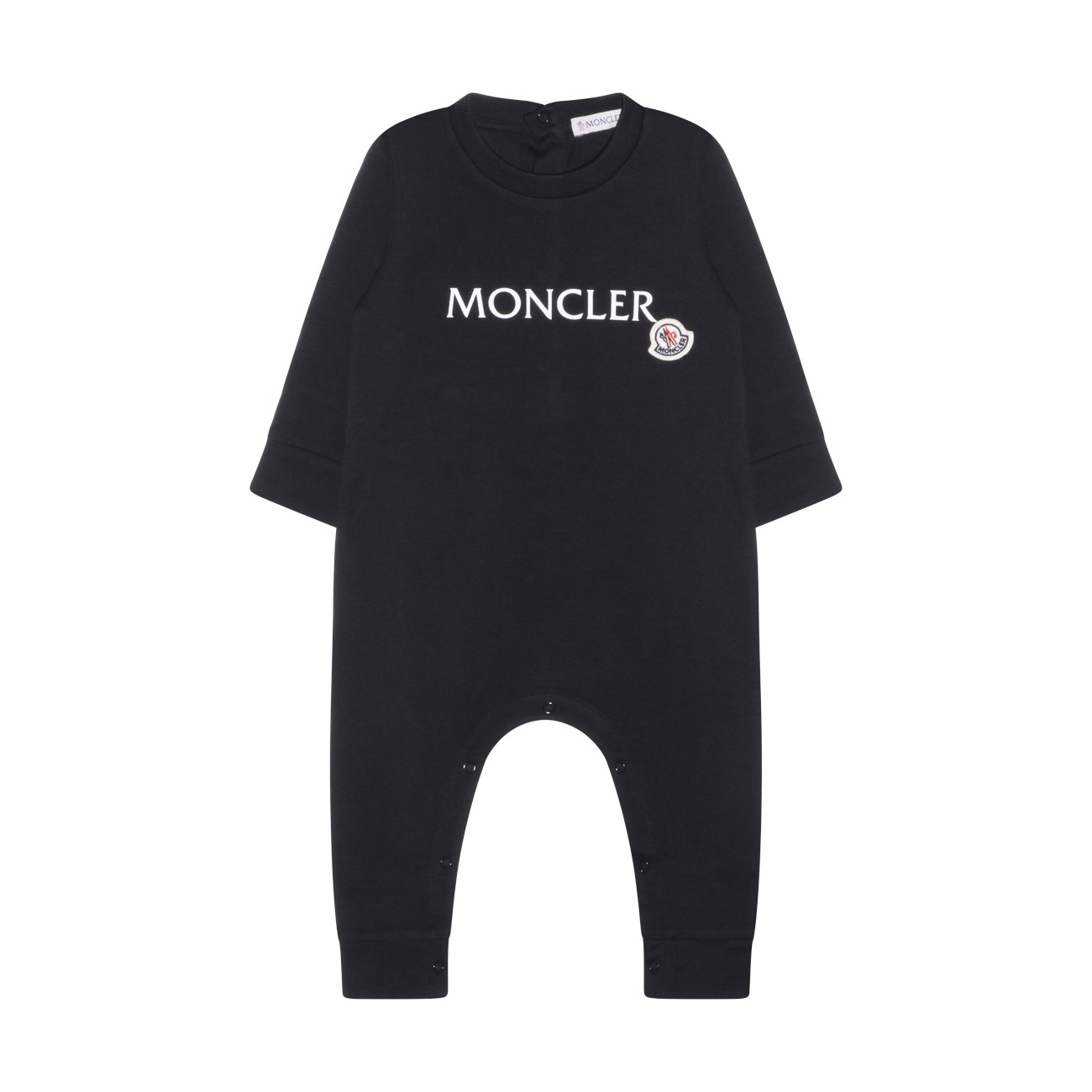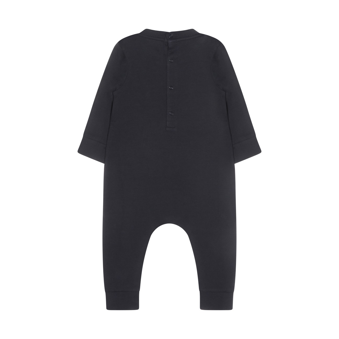 Navy cotton jumpsuit from Moncler Kids featuring long sleeves, logo detail at front, logo patch and back magnetic button closure.