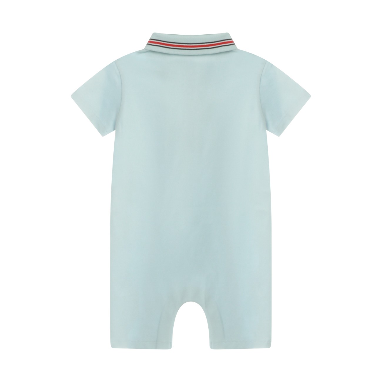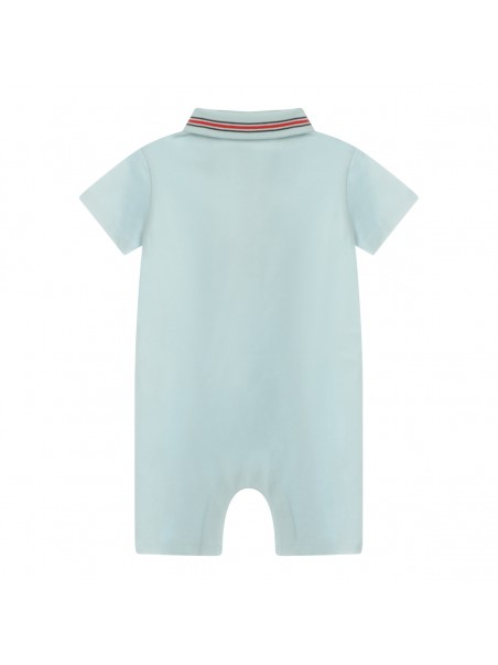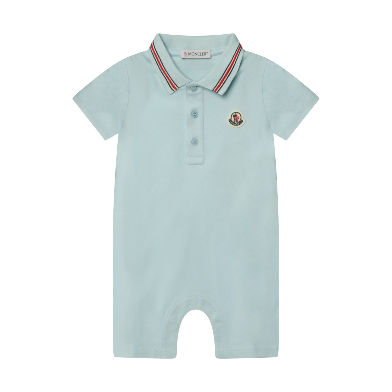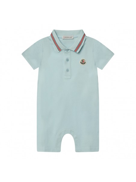 Light blue cotton jumpsuit from Moncler Kids featuring polo collar, half button closure, logo patch at chest and short sleeves.