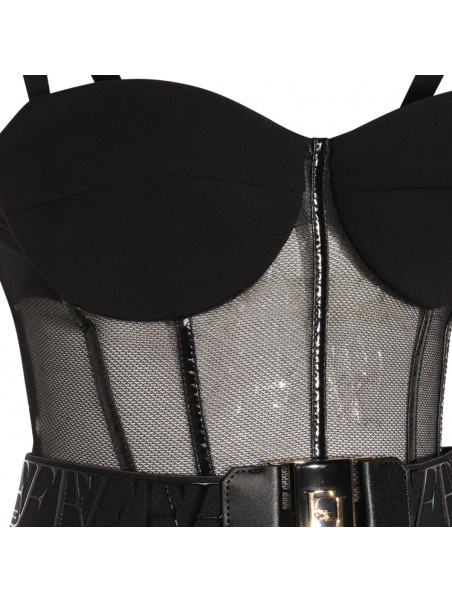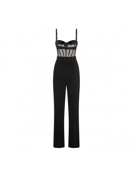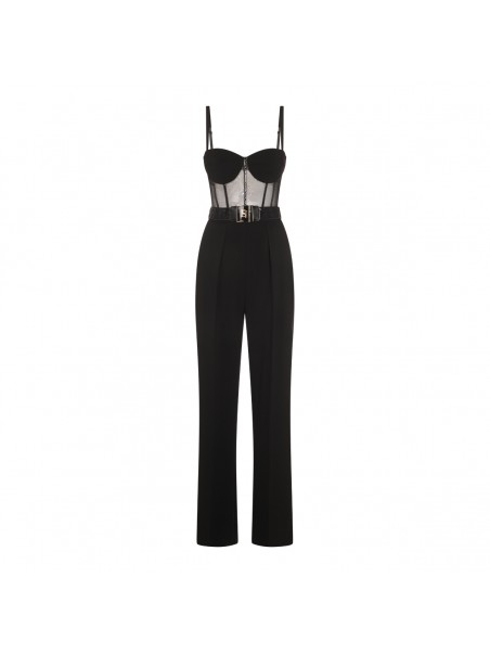 Black jumpsuit from Elisabetta Franchi featuring sleeveless, heart neckline, frontal gold tone hardware detail, zip fastening and trasparence.
