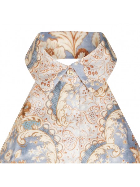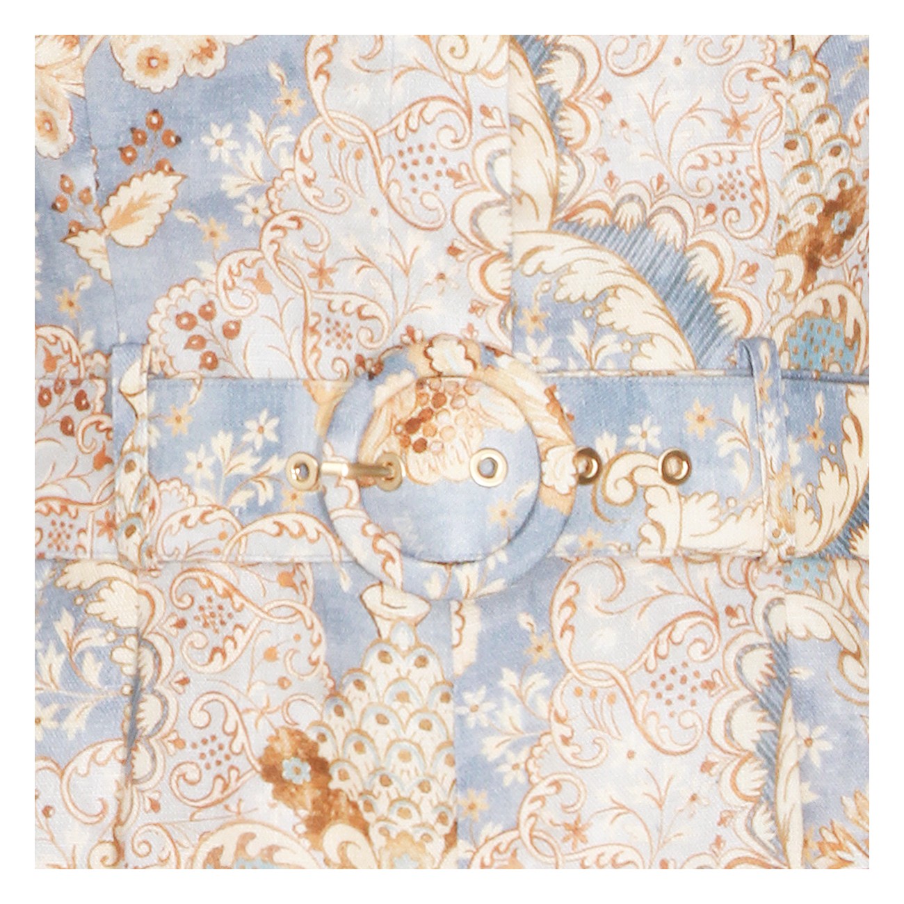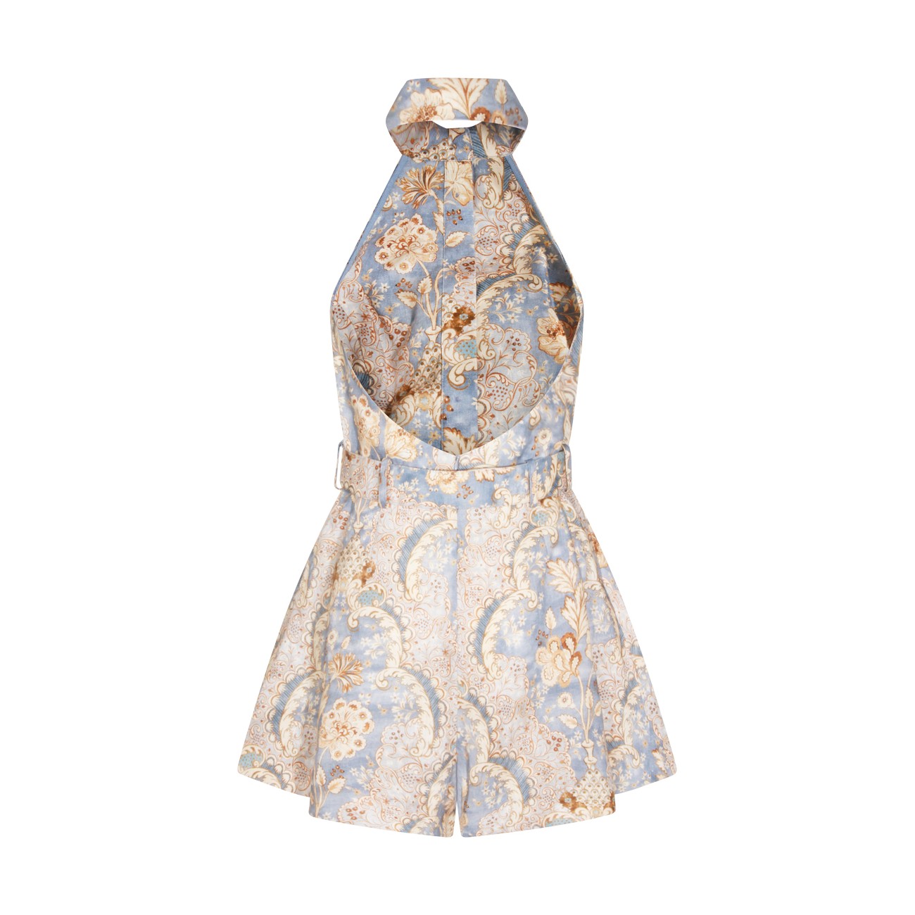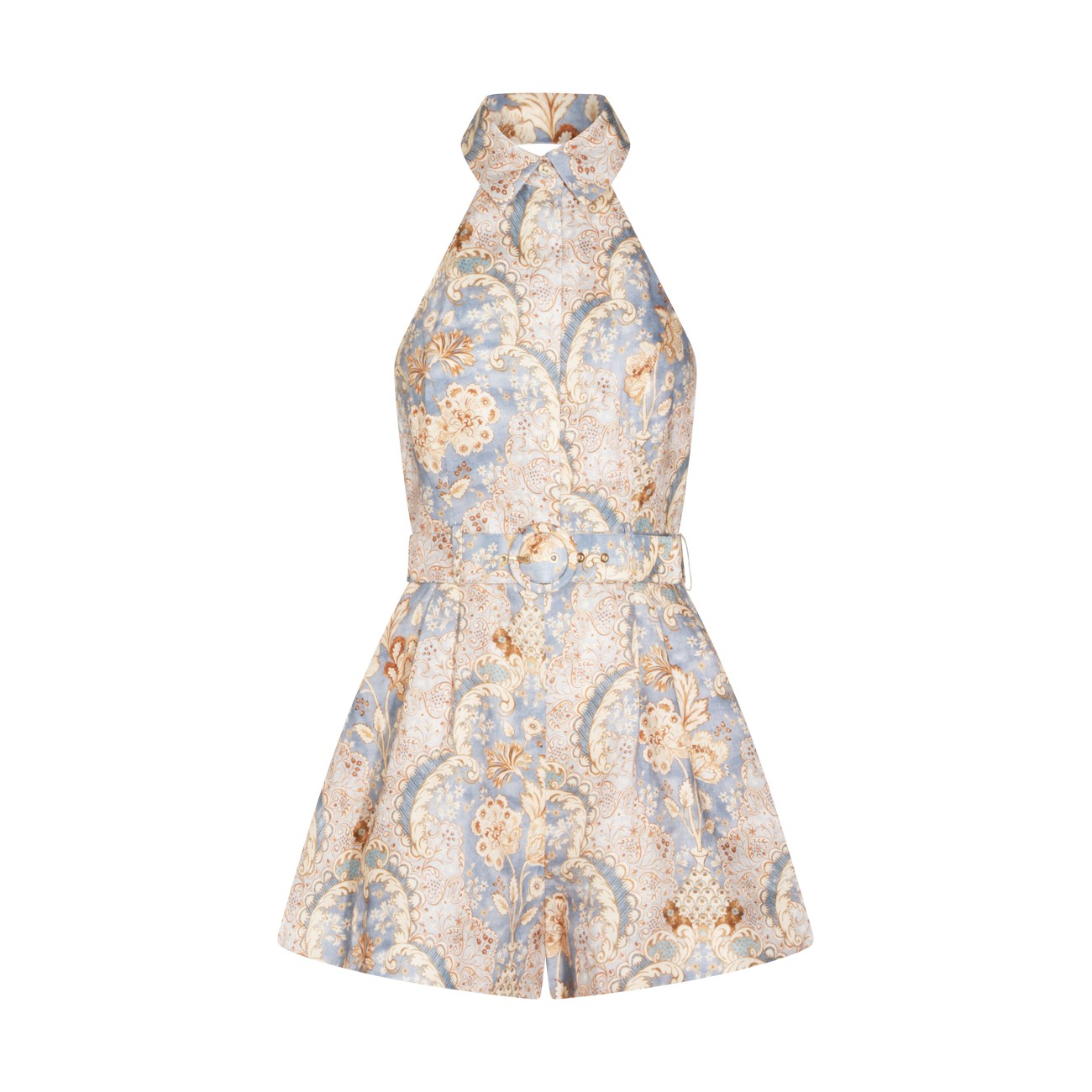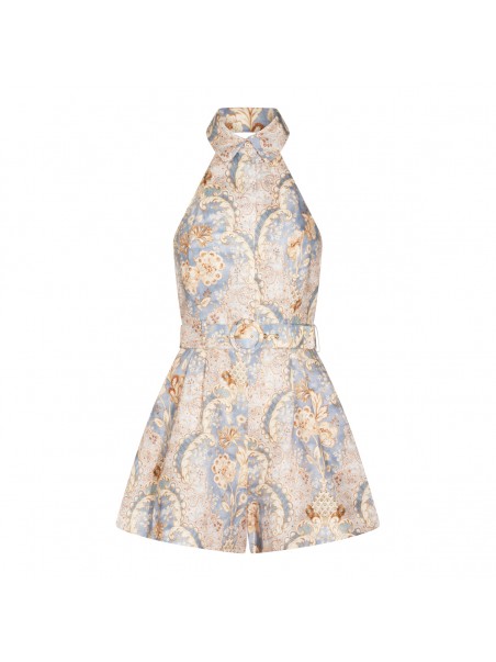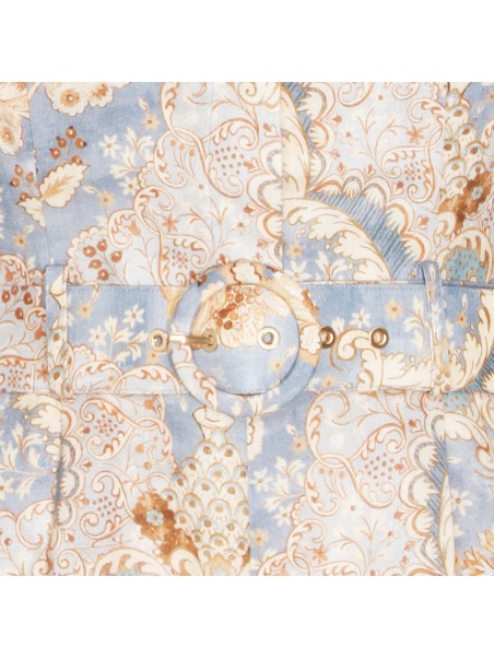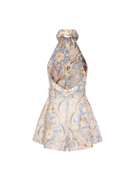 Damask denim linen jumpsuit from Zimmermann featuring shirt collar, sleeveless, frontal button fastening, waist belt and regular vestibility.