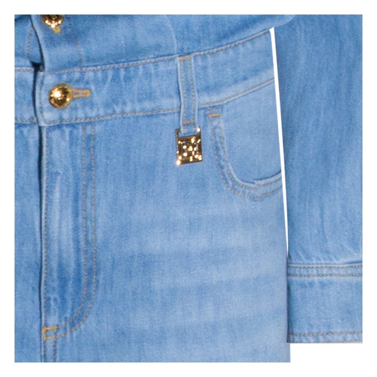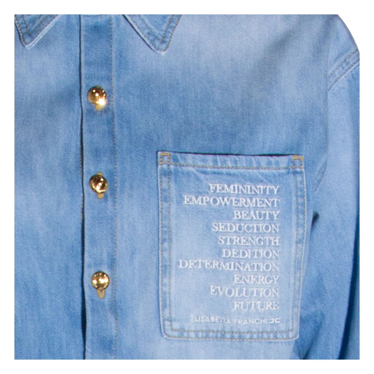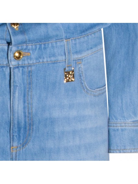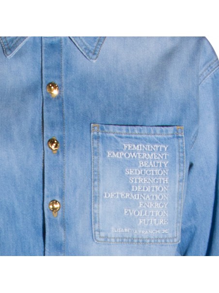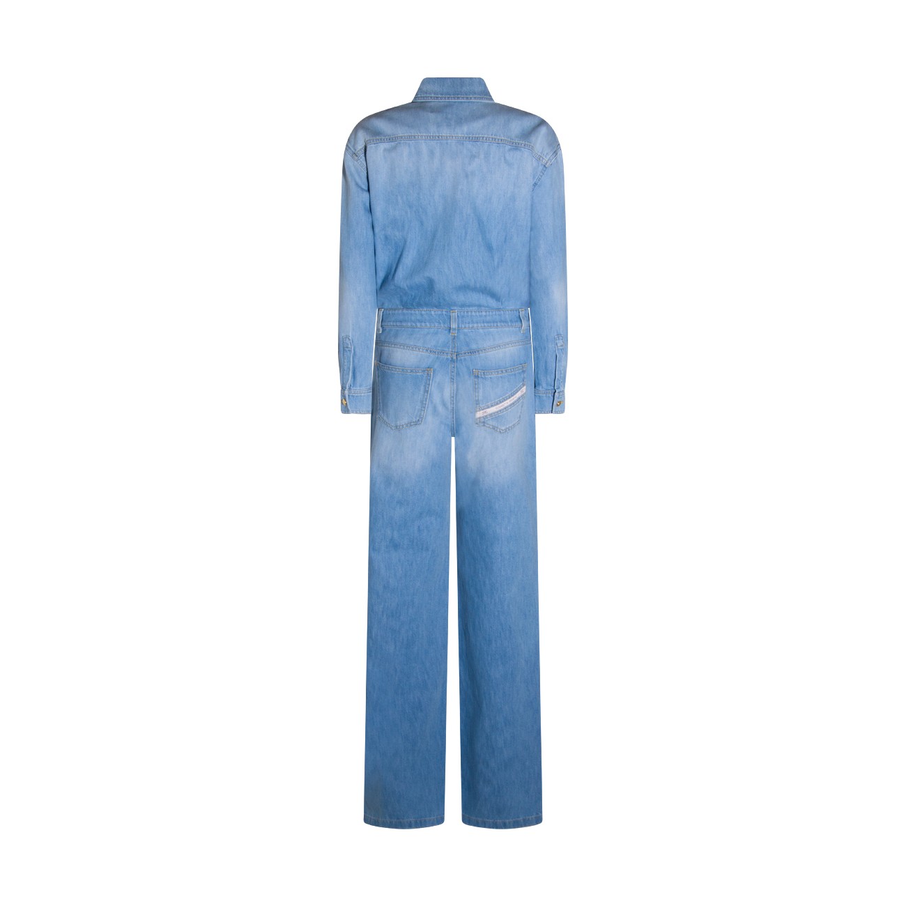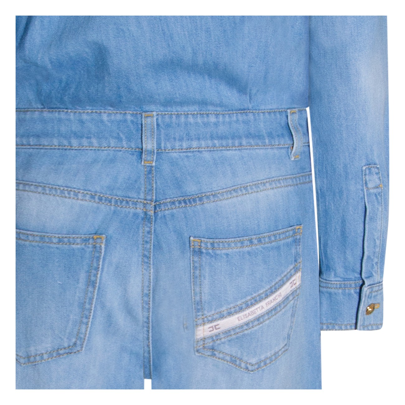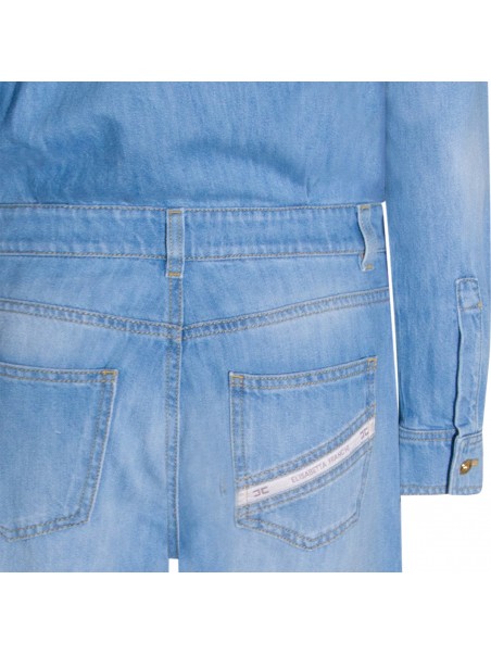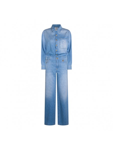 Light blue cotton jumpsuit from Elisabetta Franchi featuring shirt collar, long sleeves, frontal buttons and zip fastening, belt loops, frontal chest pocket with lettering, five-pocket, gold tone logo detail and oversize fit.