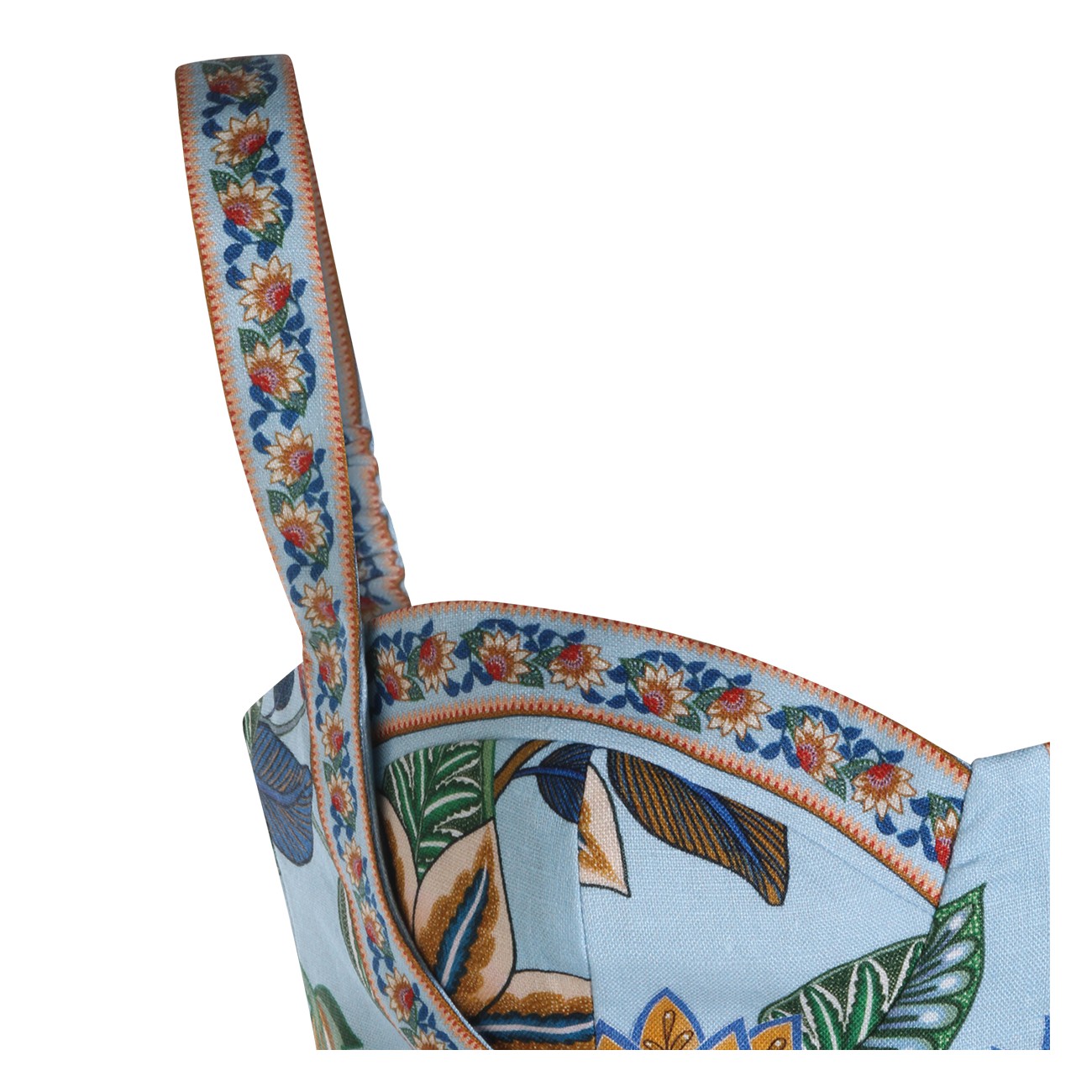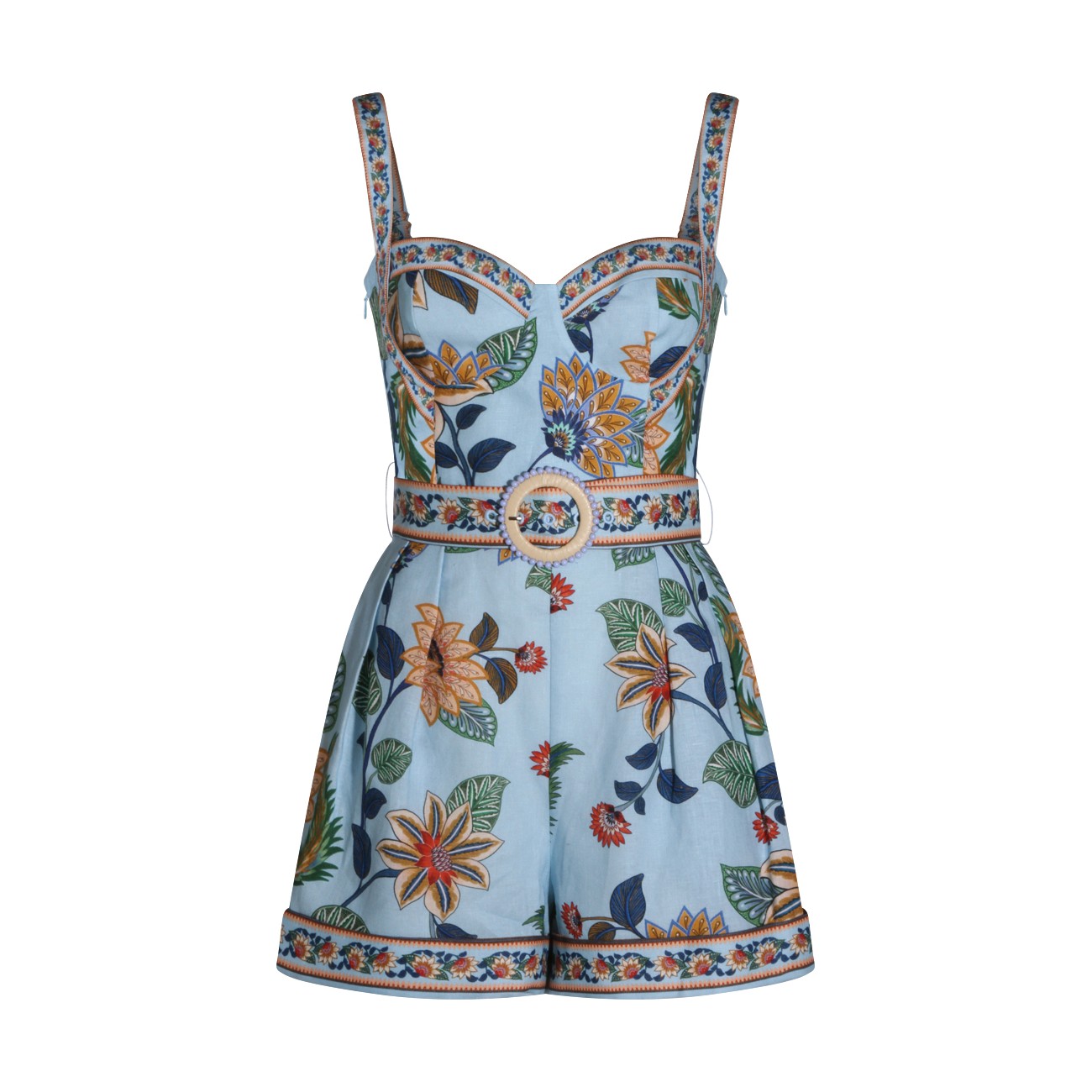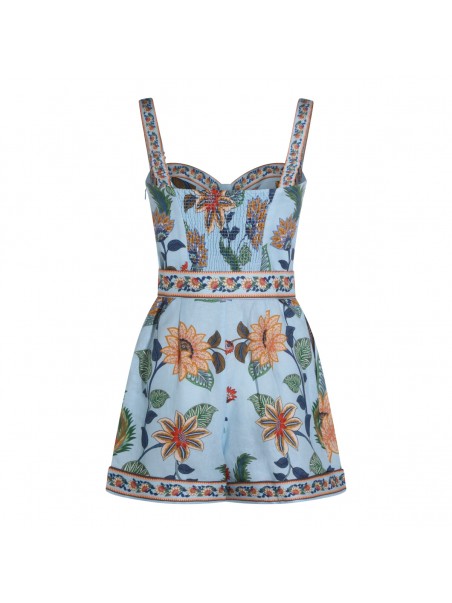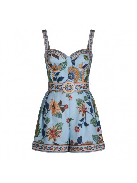 Light blue linen jumpsuit from Farm Rio featuring sleeveless, heart neckline, back zip fastening, belt waist and short length.