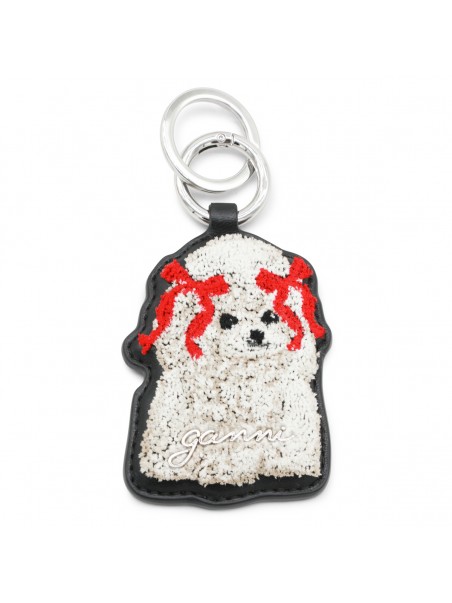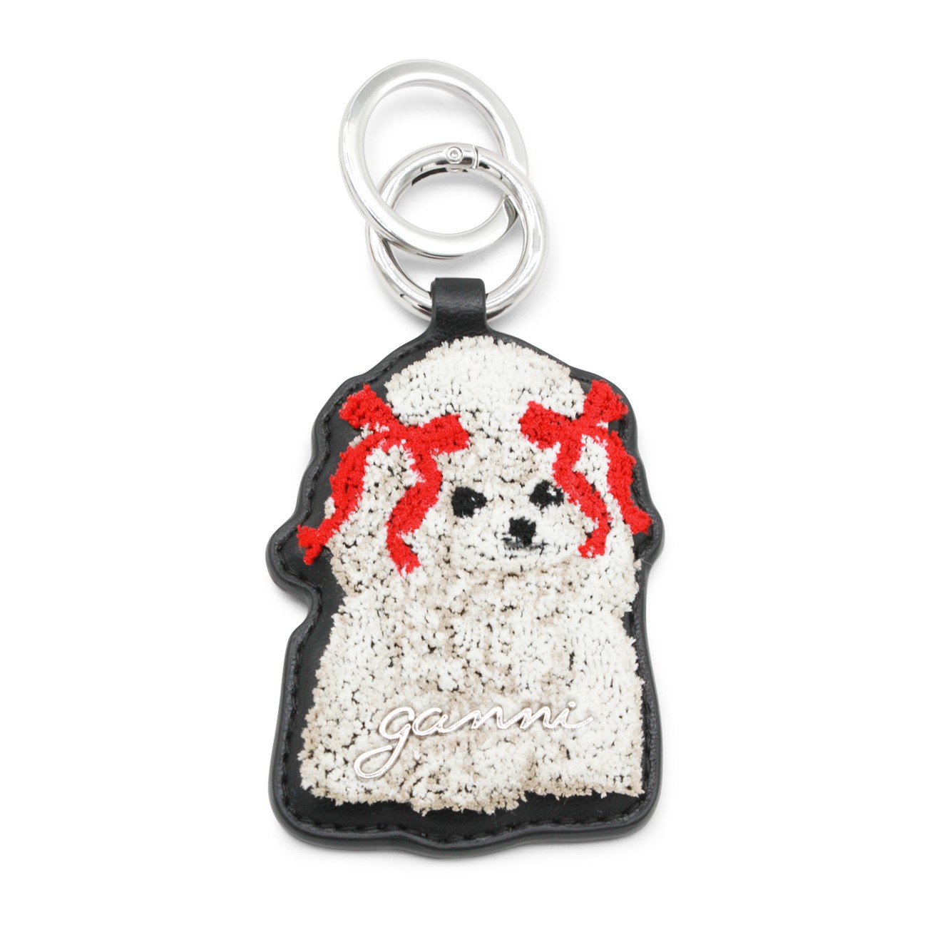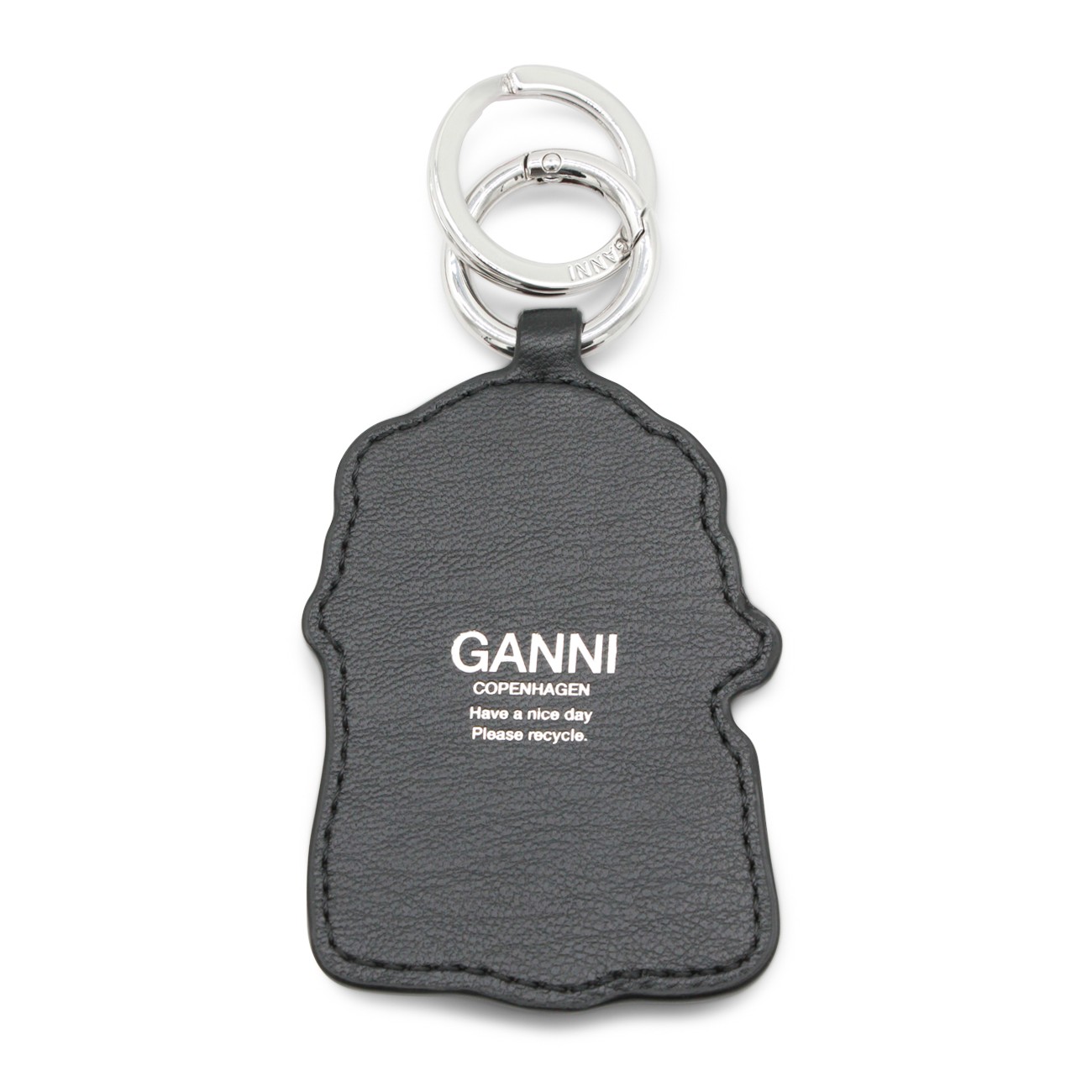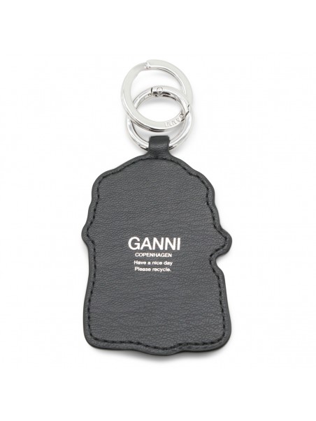 Black leather keyring from Ganni featuring silver tone hardware.