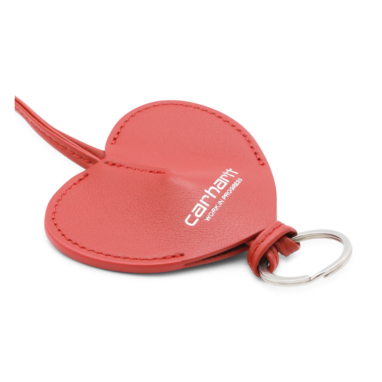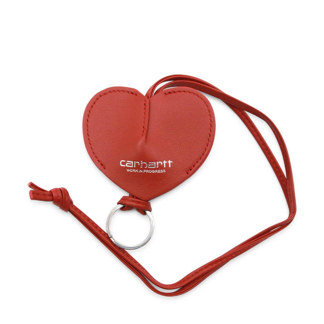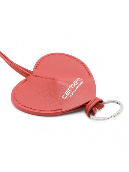 Red leather key ring from Carhartt Wip featuring heart shape, silver tone hardware and logo.