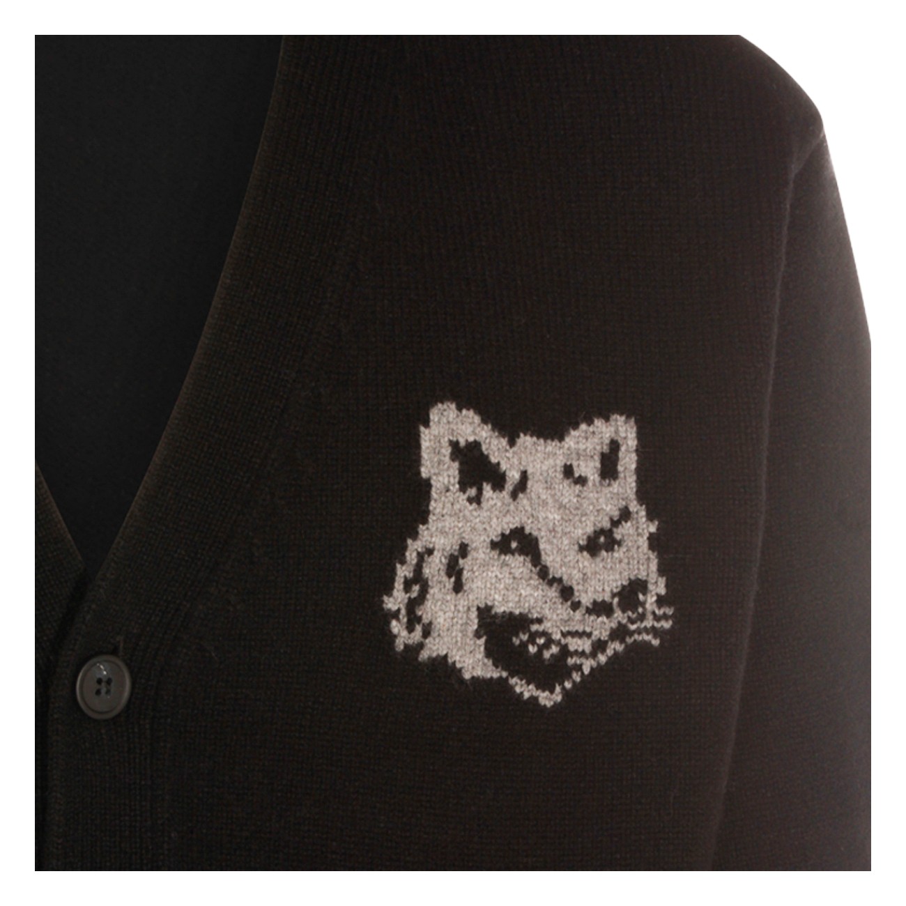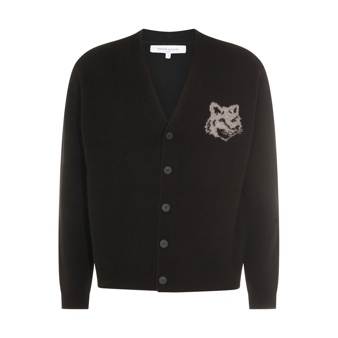 Black wool knitwear from Maison Kitsune featuring long sleeves, v neckline, buttons fastening and logo.