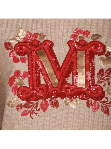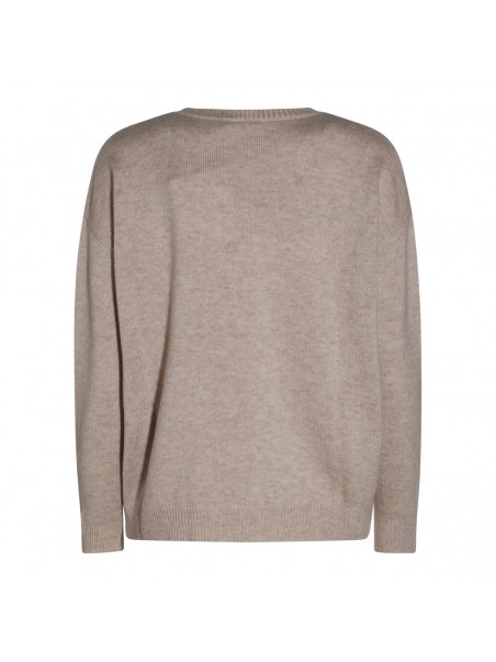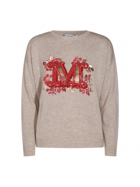 Grey wool knitwear from Max Mara featuring long sleeves, round collar, frontal logo detail and soft vestibility.