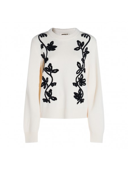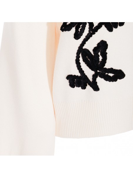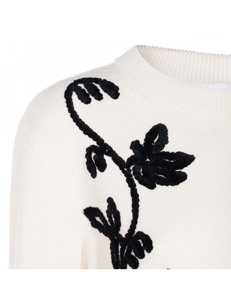 White wool knitwear from Jil Sander featuring round collar, long sleeves, embroidered floral pattern and regular vestibility.