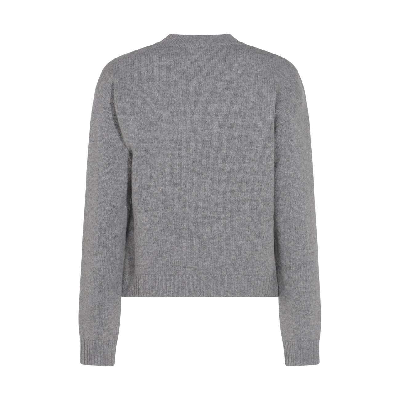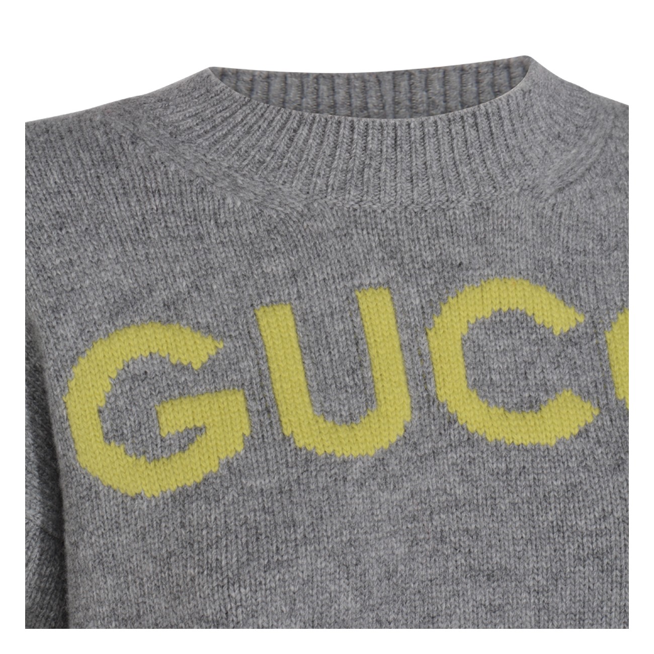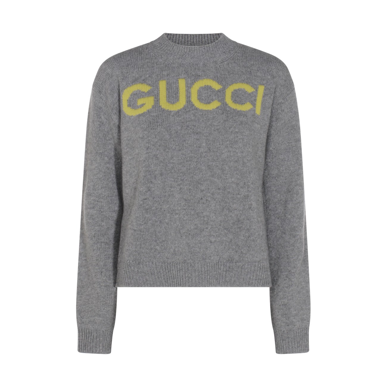 Grey wool knitwear from Gucci featuring long sleeves, round collar and frontal logo.