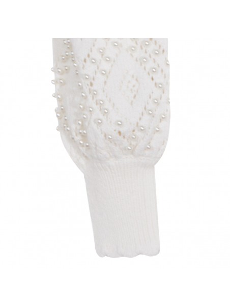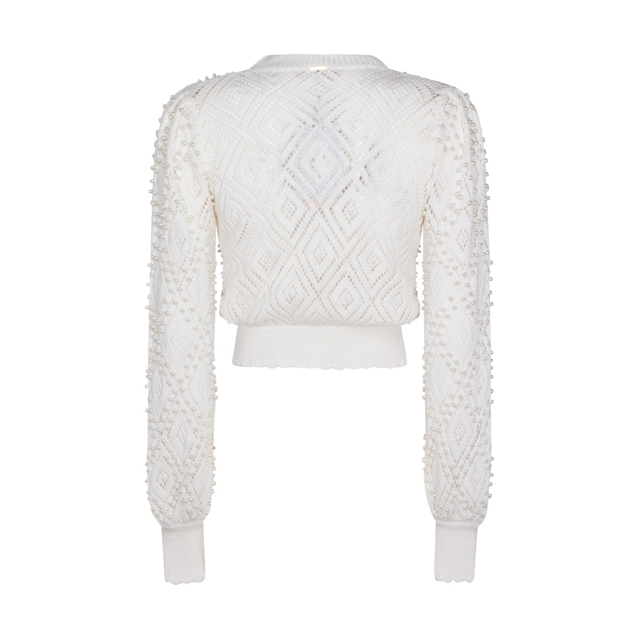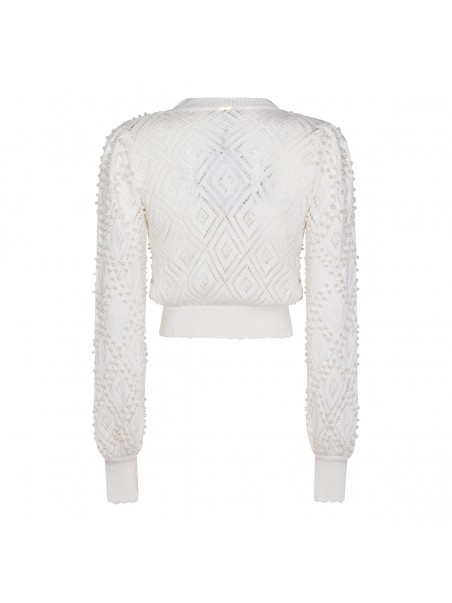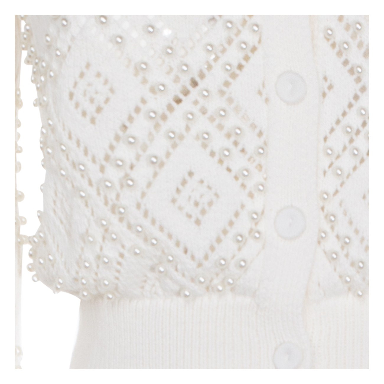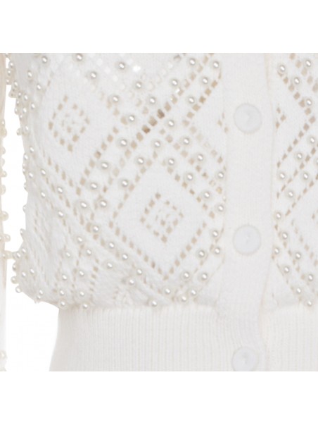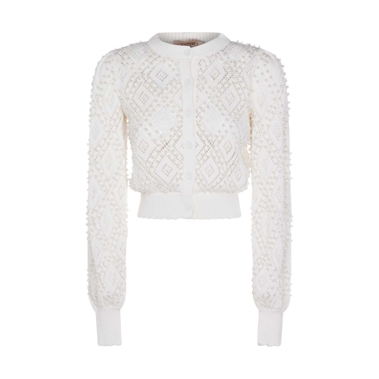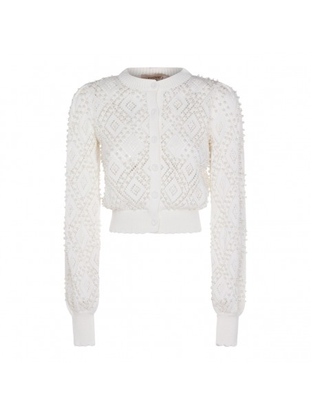 White cotton cardigan from Twinset featuring korean-style collar, long sleeves, covered button clsoure, ribbed trim, scalloped hems, diamond-pattern design, pearl rivet appliqués and relaxed fit.