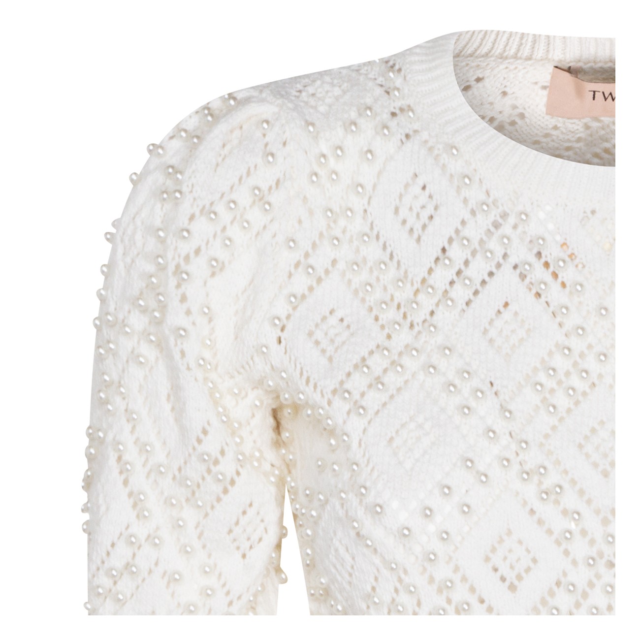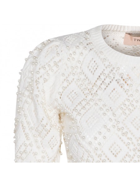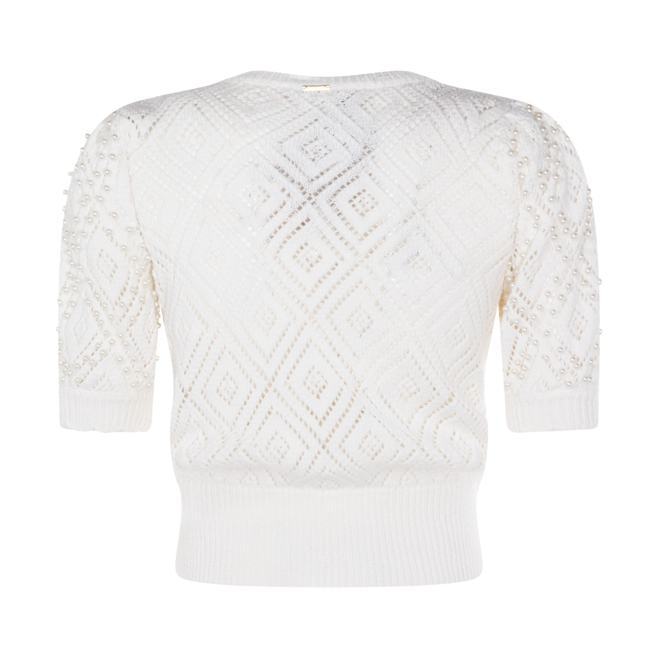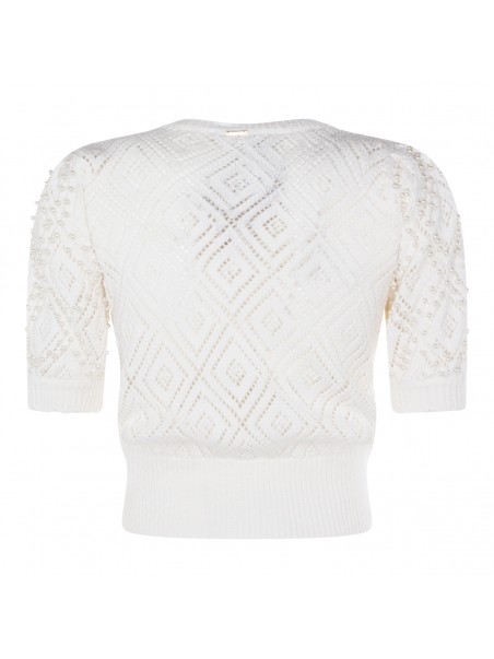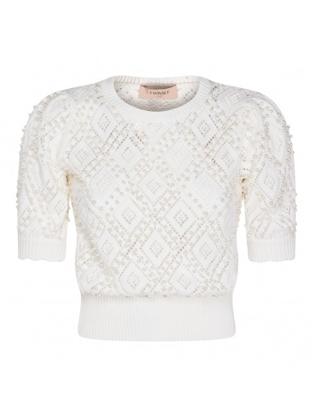 White cotton knitwear from Twinset featuring crew neck, short sleeves, ribbed trim, diamond-pattern design, pearl rivet appliqués and relaxed fit.