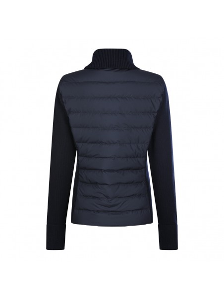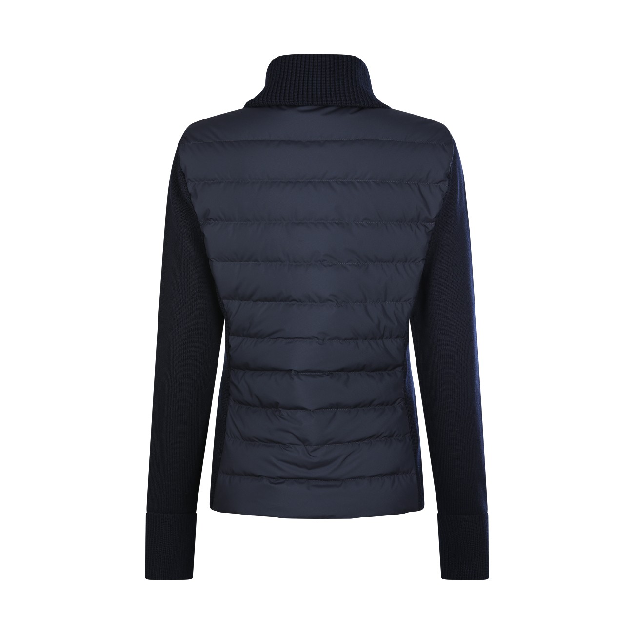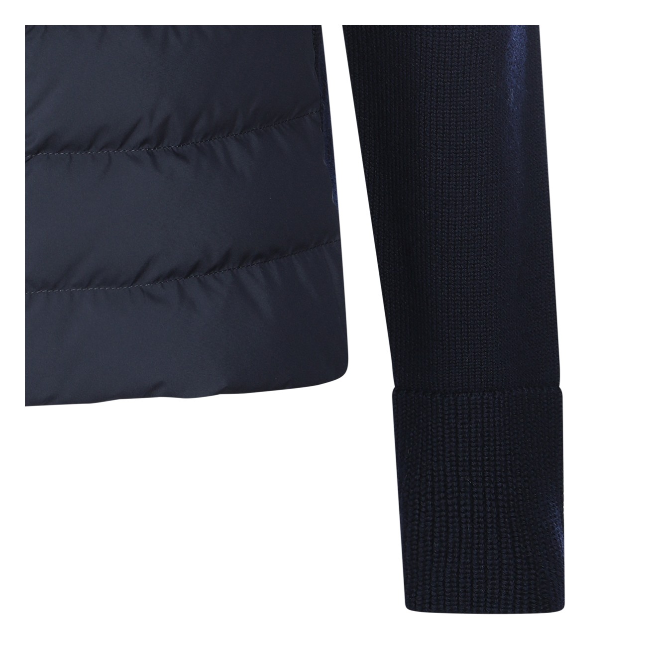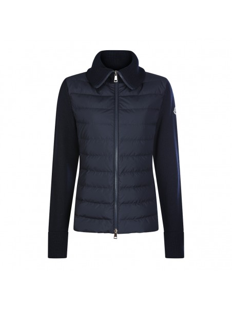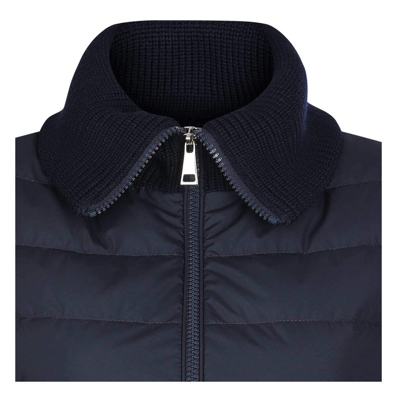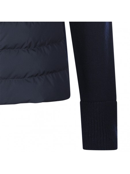 Navy knitwear from Moncler featuring high collar, zipped closure, long wool sleeves, snap button closre, sleeve logo patch, padded torso and slim fit.