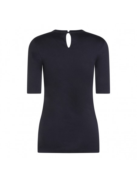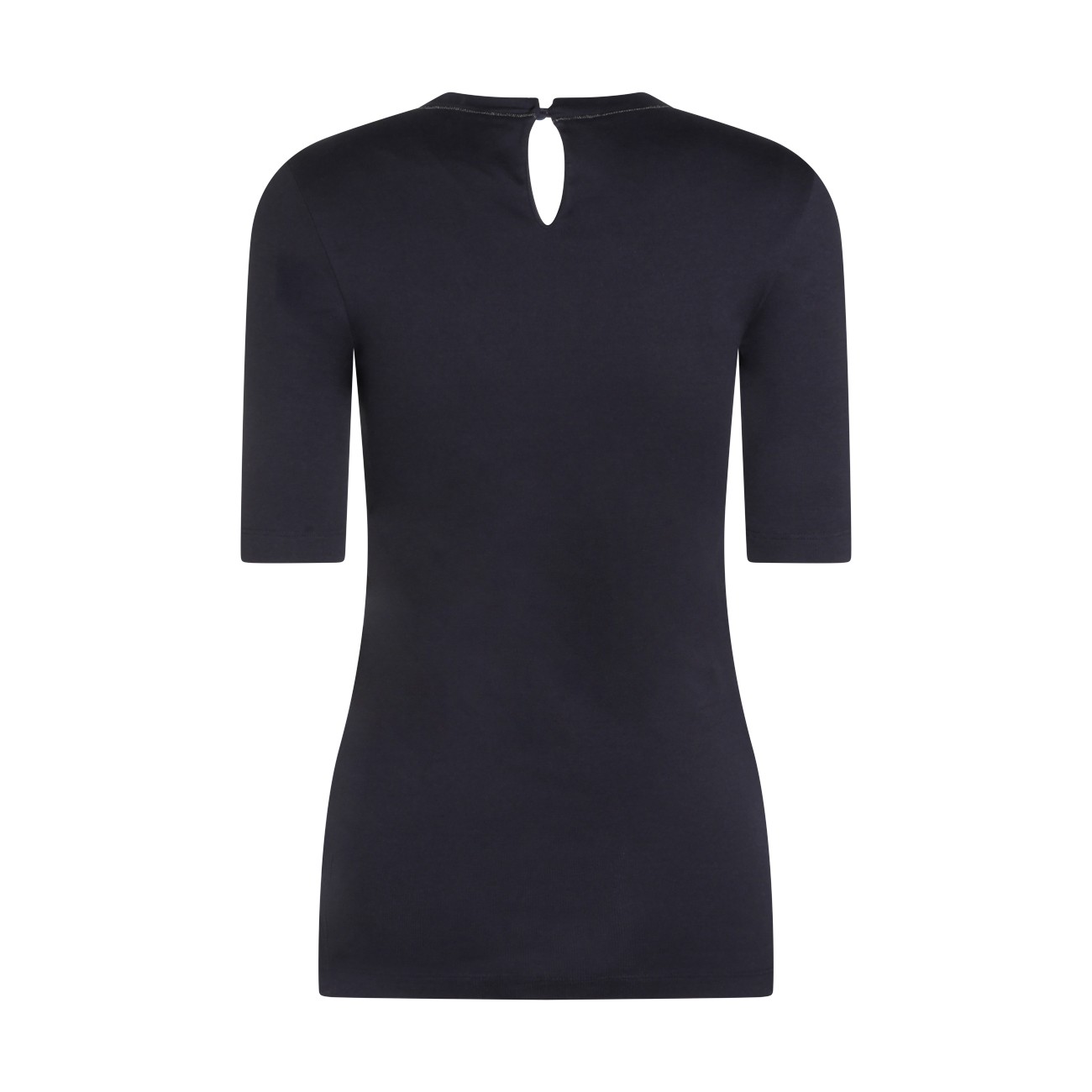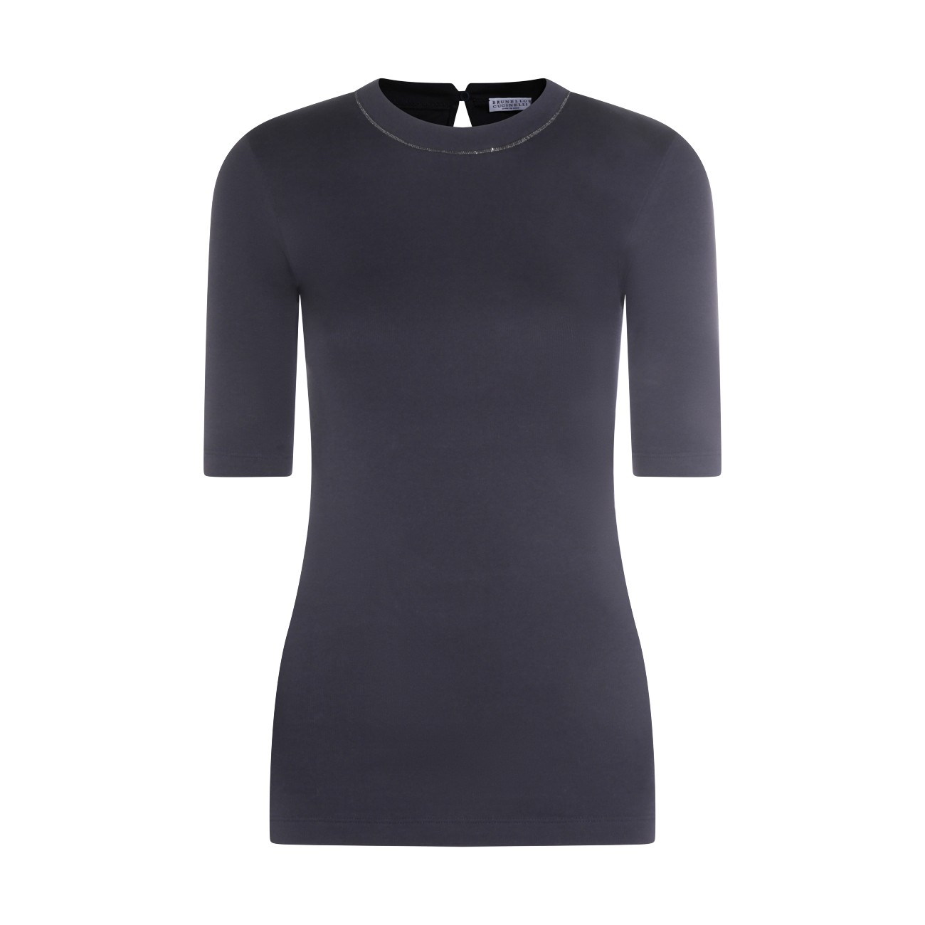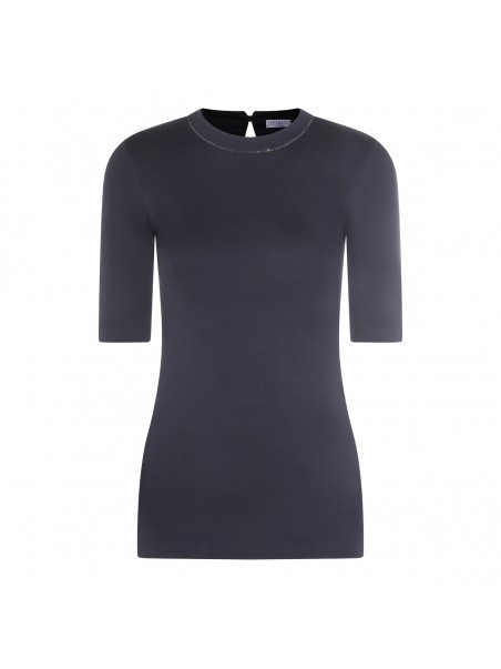 Dark blue cotton knitweear from Brunello Cucinelli featuring round collar, midi sleeves, back fastening and elasticizated vestibility.