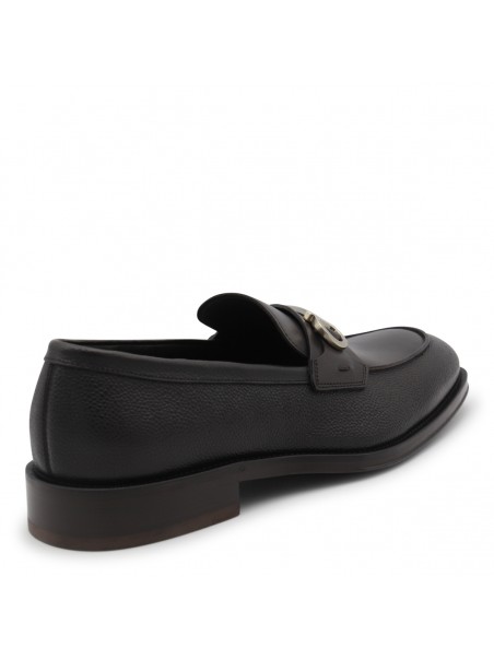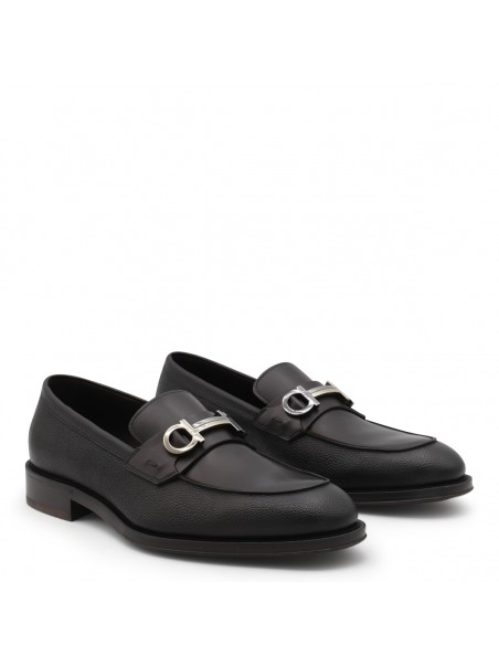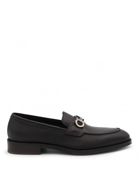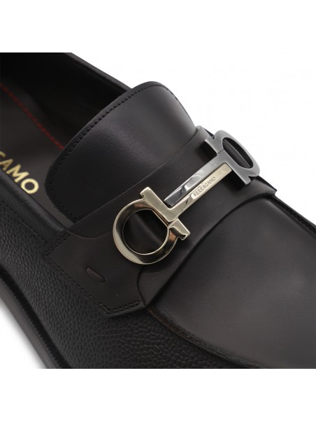 Black leather loafers from Ferragamo featuring round toe, silver tone detail, leather sole and logo detail.