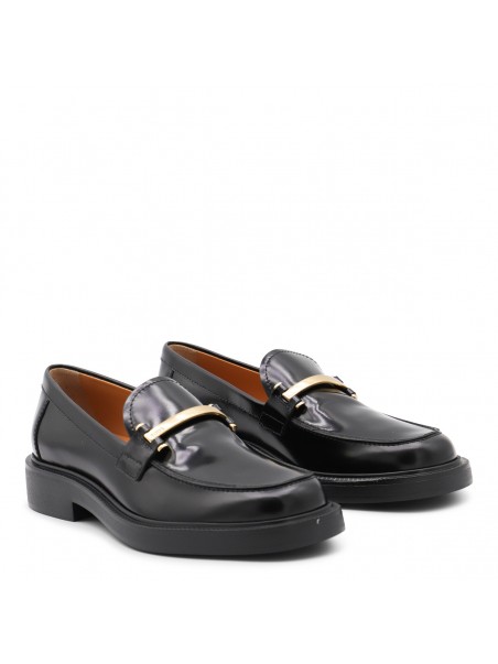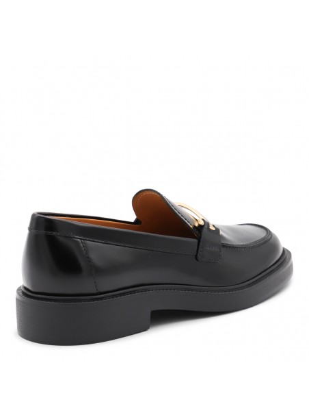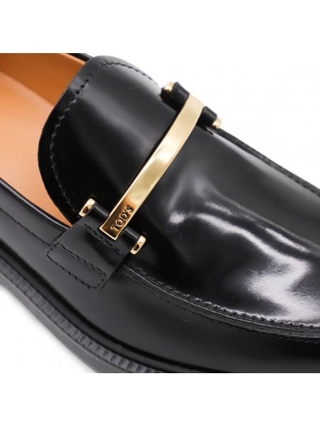 Black leather loafers from Tod's featuring round toe, gold tone hardware, leather sole and logo.