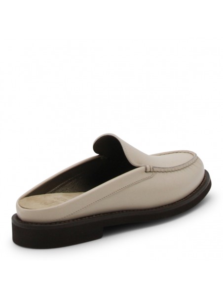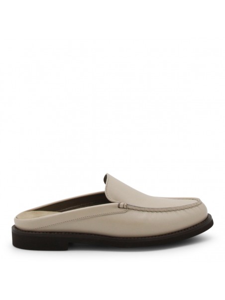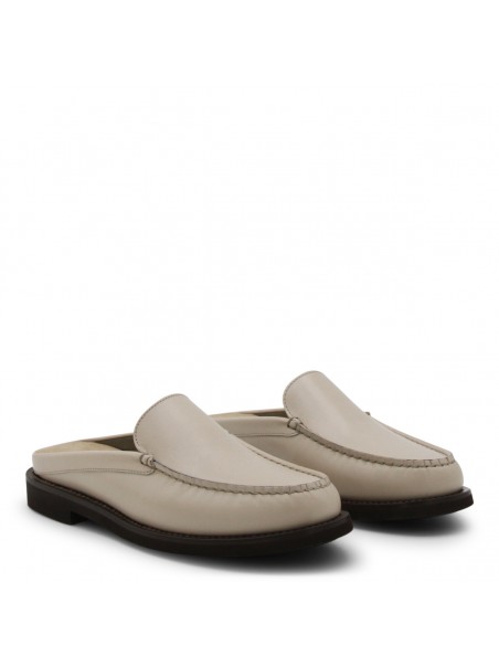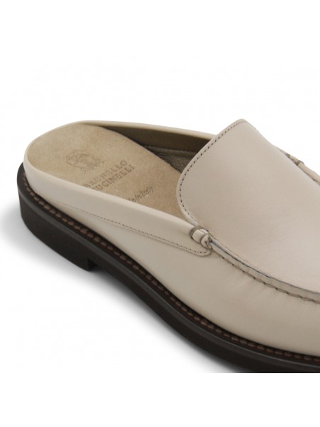 Light beige leather loafers from Brunello Cucinelli featuring round toe, open back and leather sole.