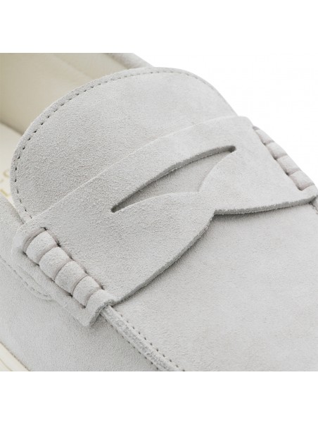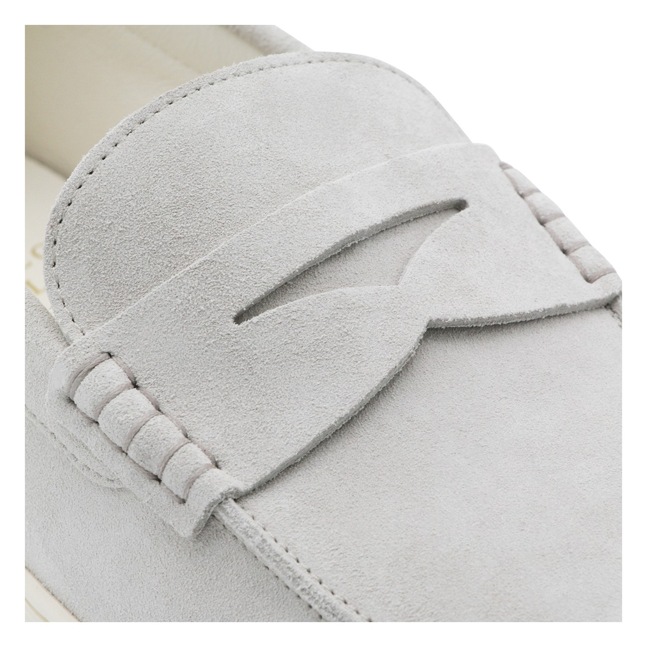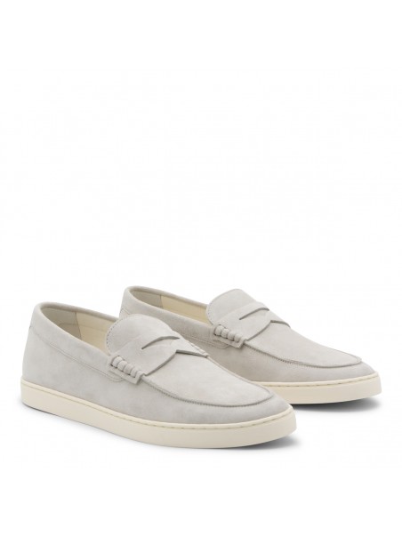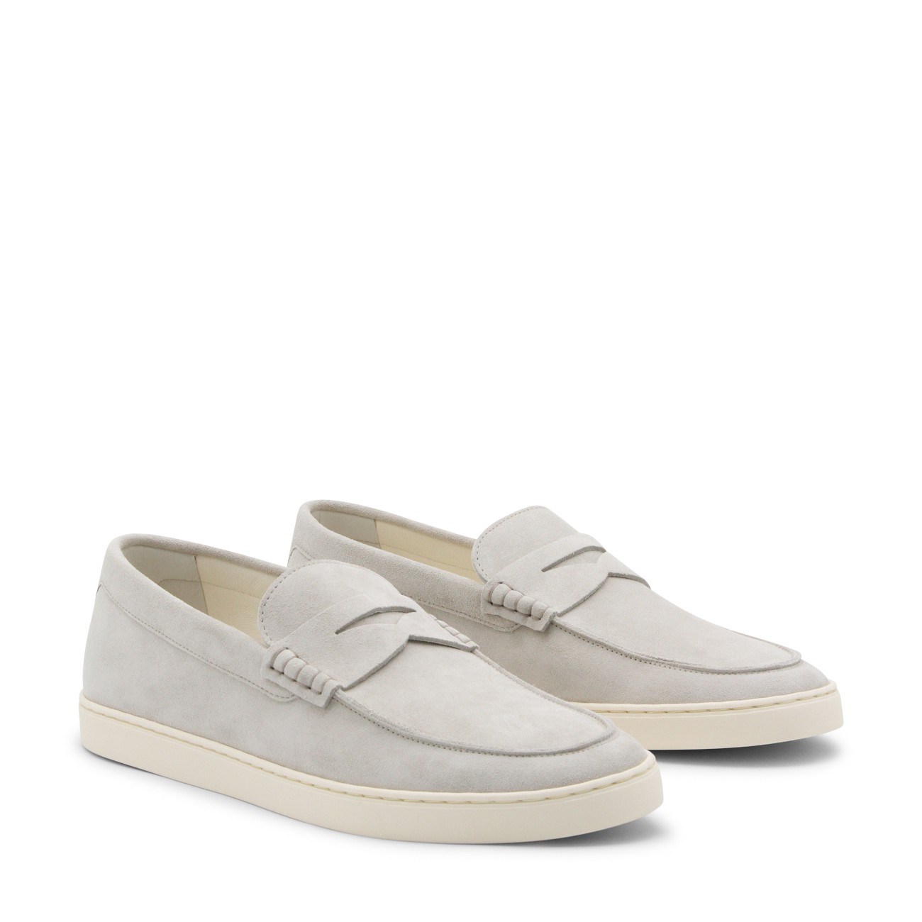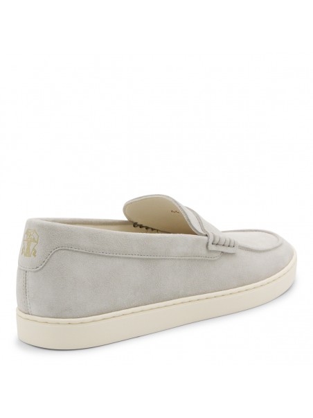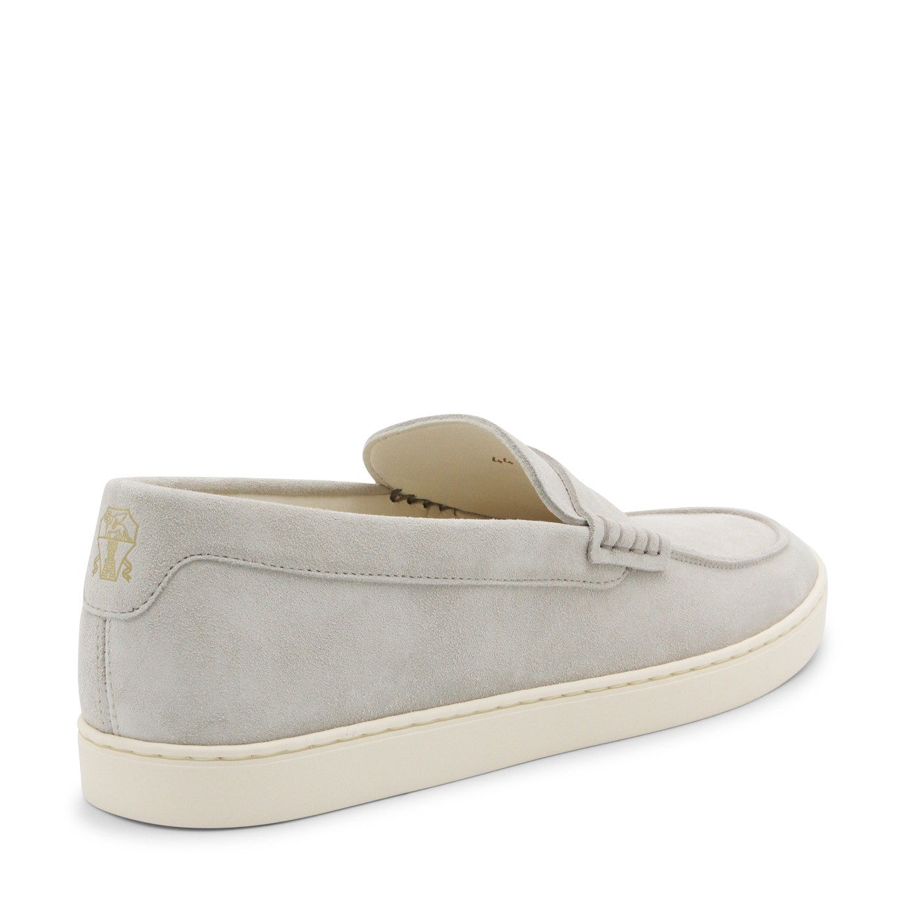 Grey leather loafers from Brunello Cucinelli featuring round toe, slip-on style, back logo and rubber sole.
