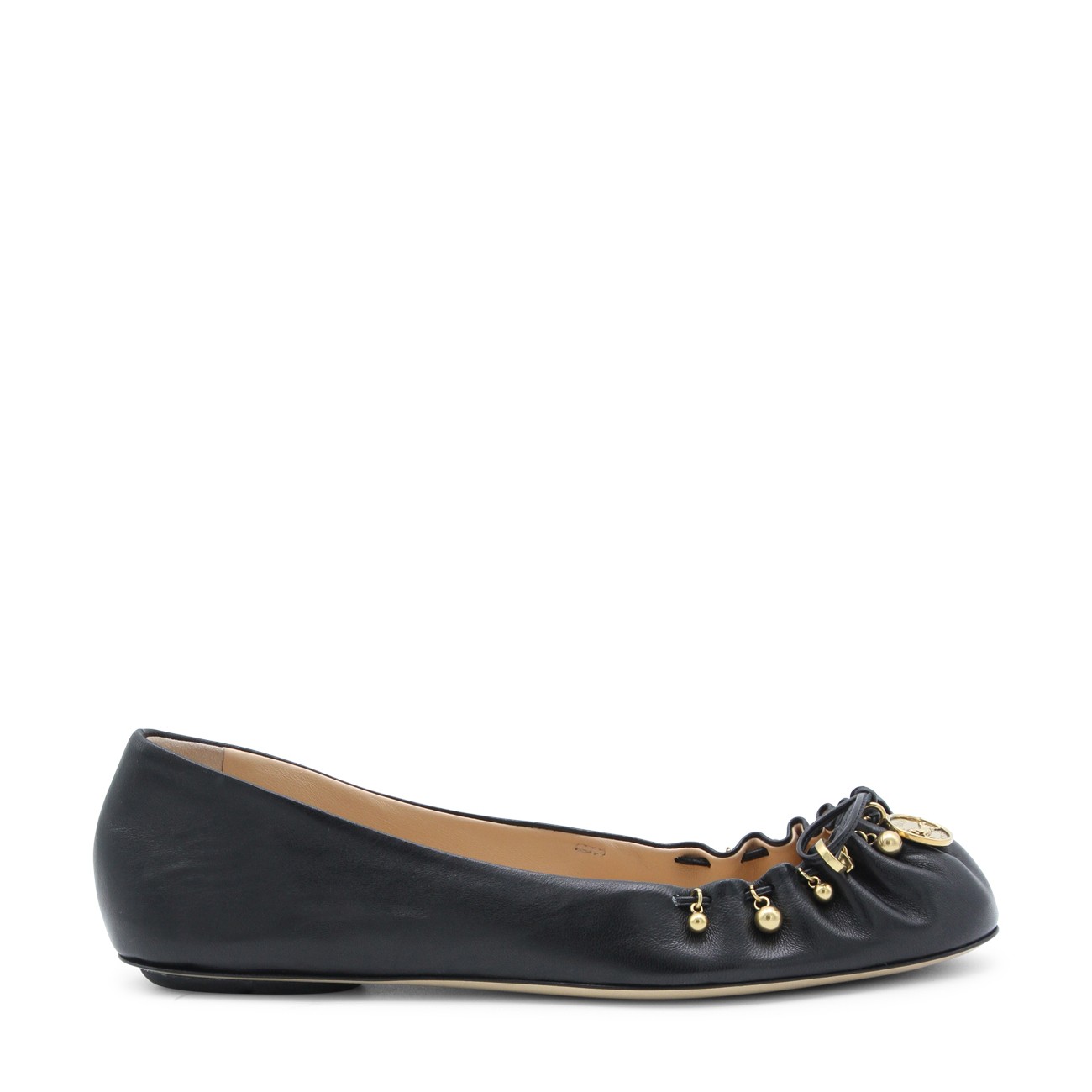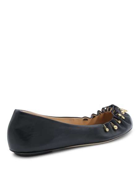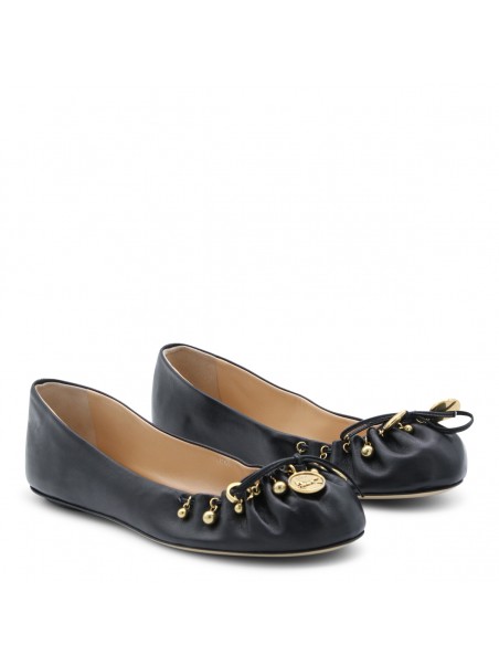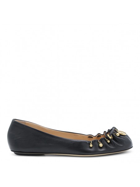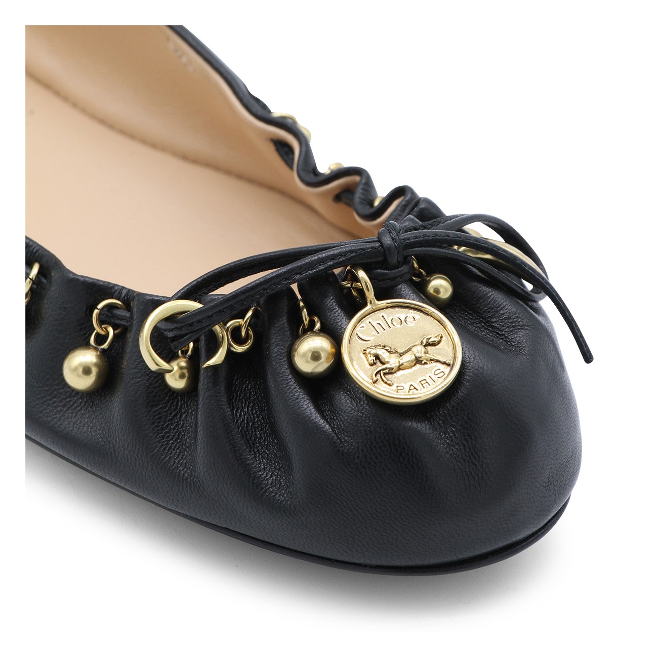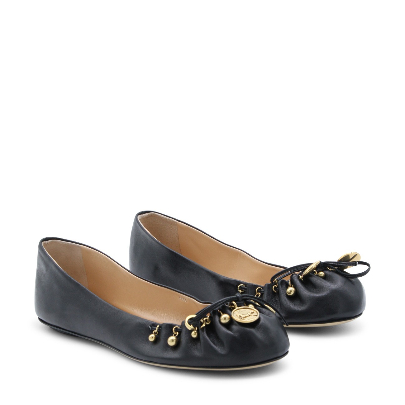 Black leather Chloé Charms formal shoes from Chloé featuring pointed toe, slip-on style, pleated front, tone-on-tone bow details, gold-tone charms and leather sole.