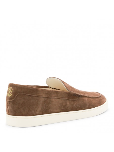 Brown leather loafers from Brunello Cucinelli featuring round toe, slip-on style, back logo and rubber sole.