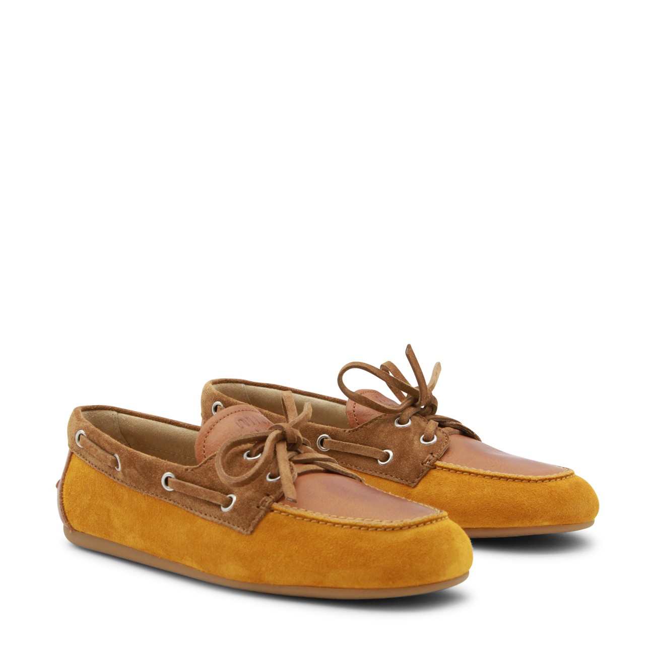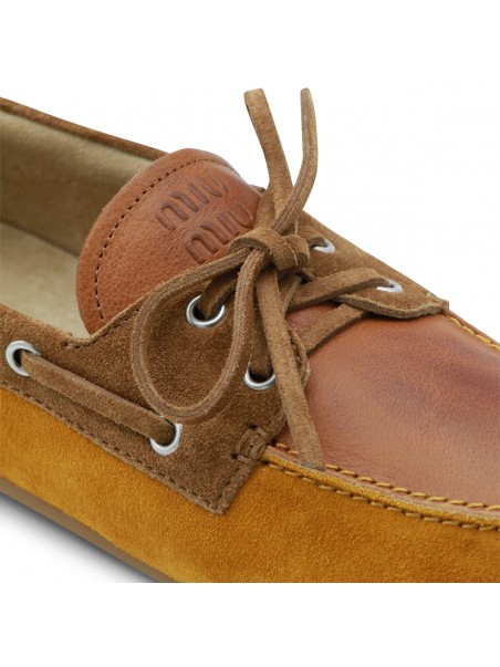 Camel leather loafers from Miu Miu featuring round toe, silver tone hardeare, suede and leather sole.