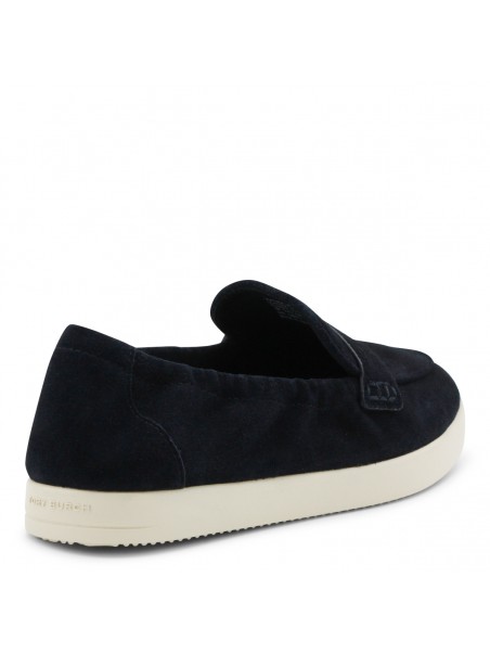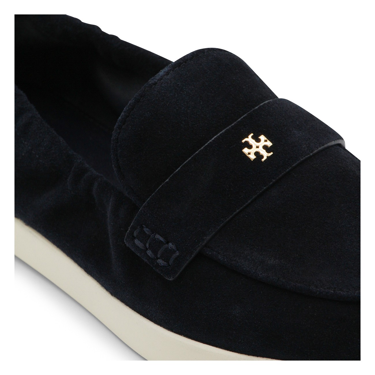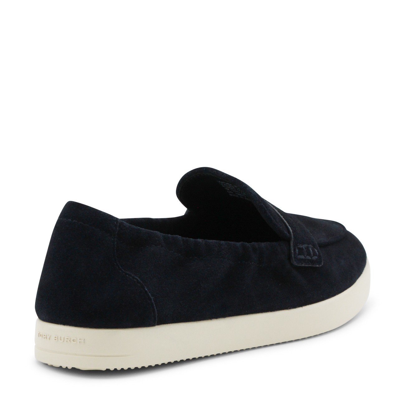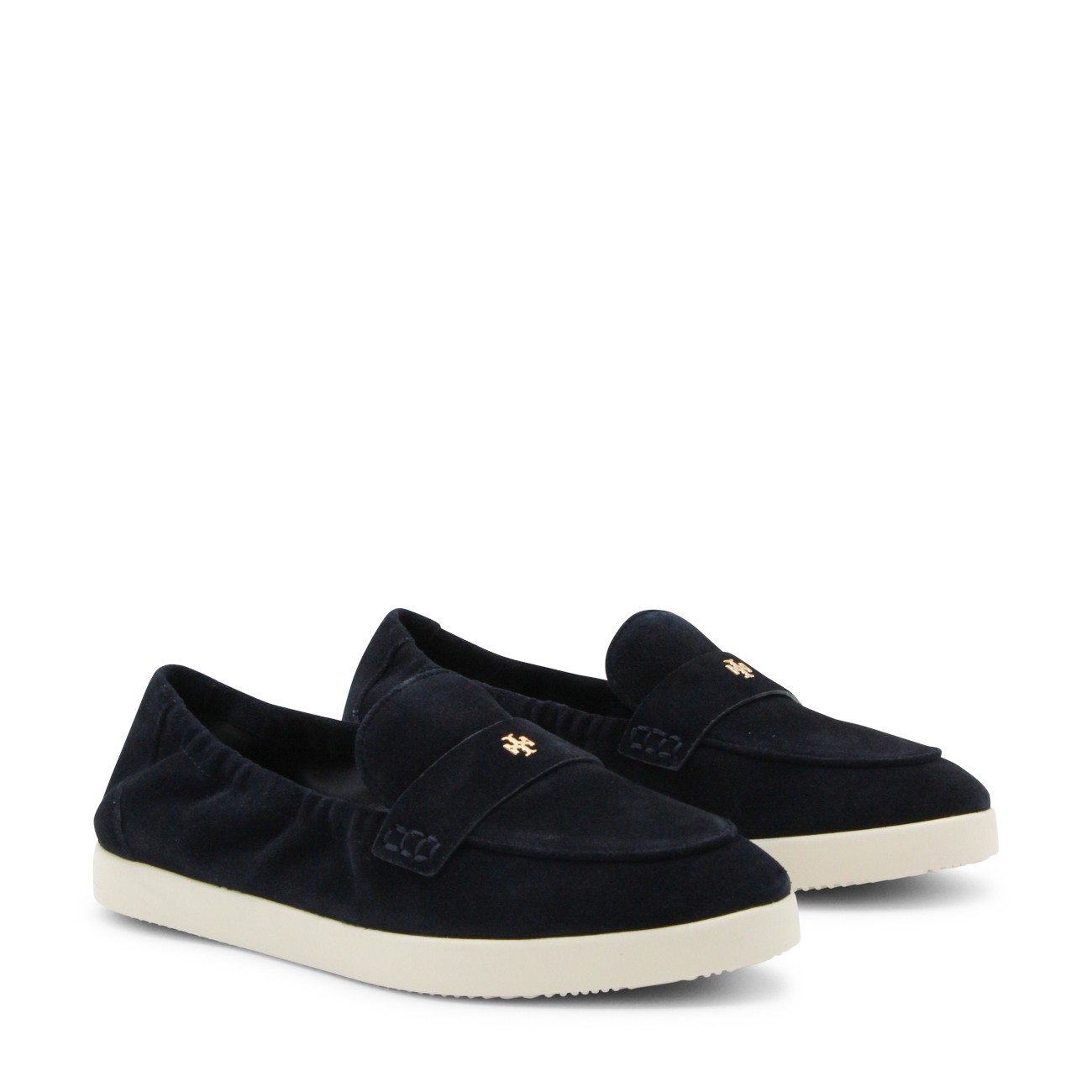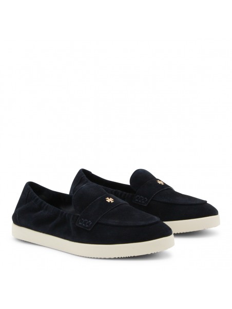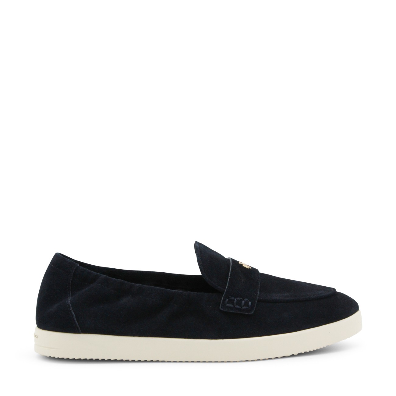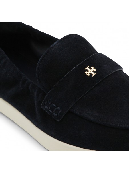 Navy suede loafers from Tory Burch featuring rubber sole, slip on style, logo plaque, gold tone metal hardware and branded insole.