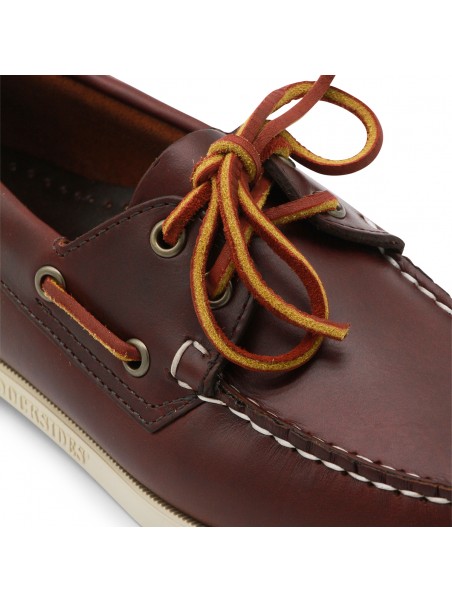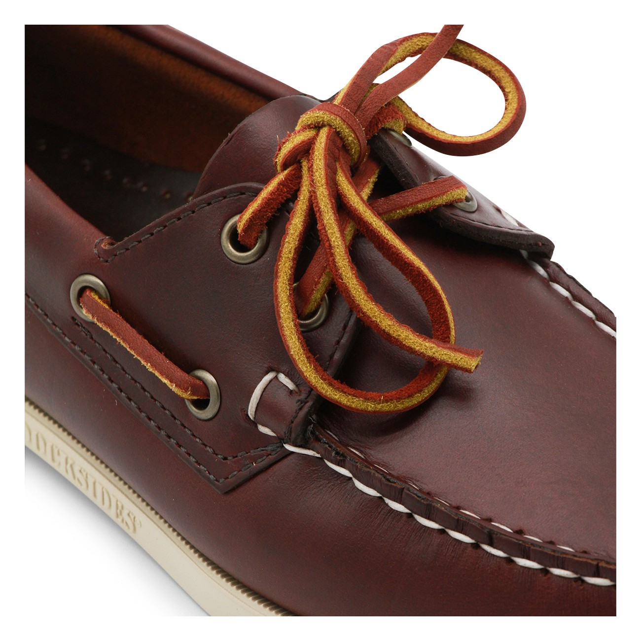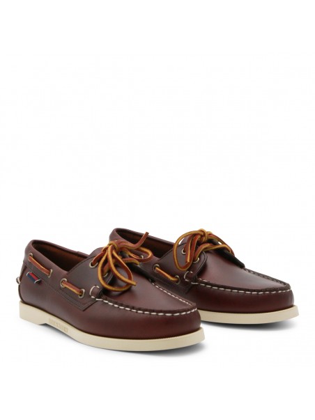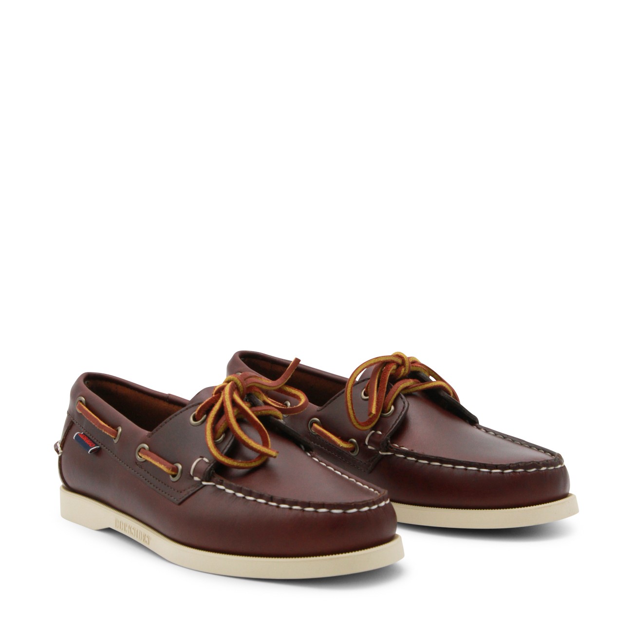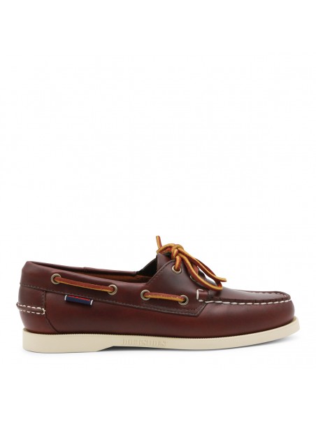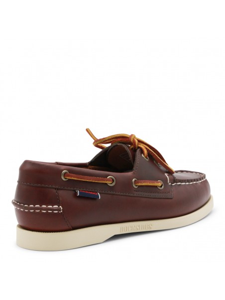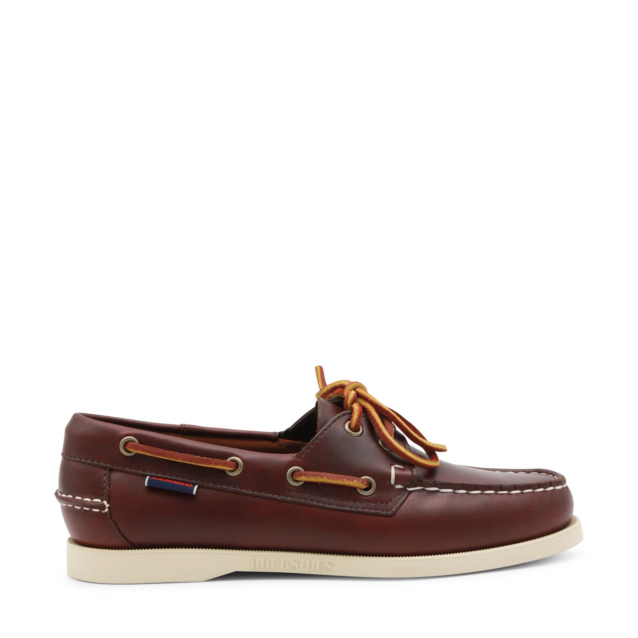 Brown leather Portland Docksides loafers form Sebago featuring rubber sole, leather lace, logo label and slip on line.