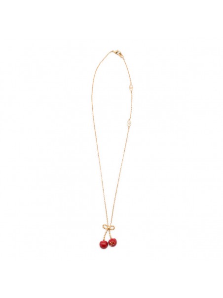 Gold metal Cherryfic necklace from Valentino Garavani featuring gold tone hardware, cherry pendant with logo detail, snap hook closure and adjustable length.