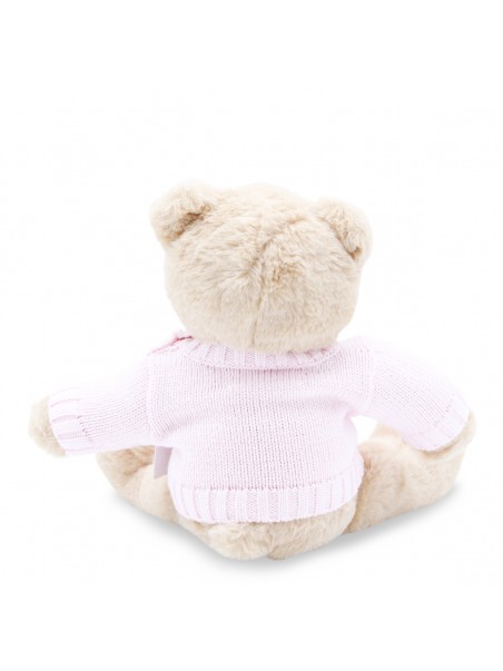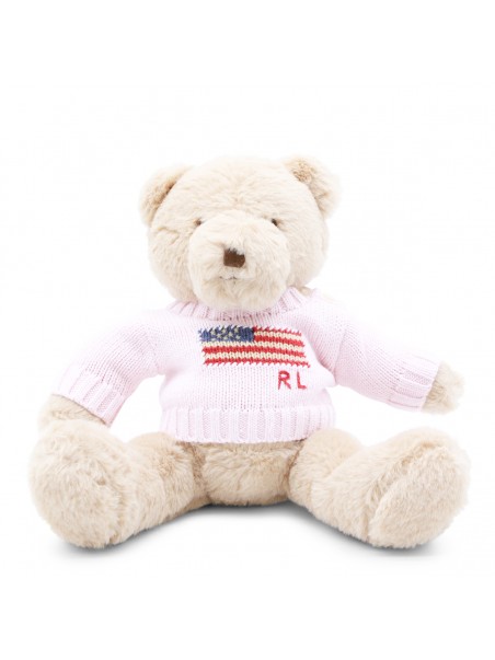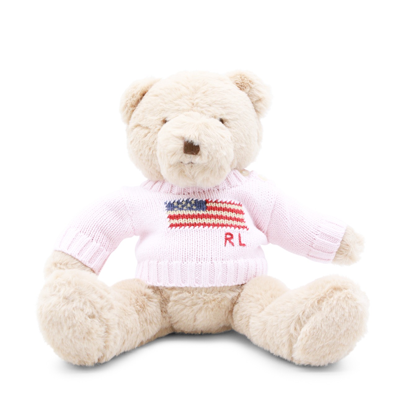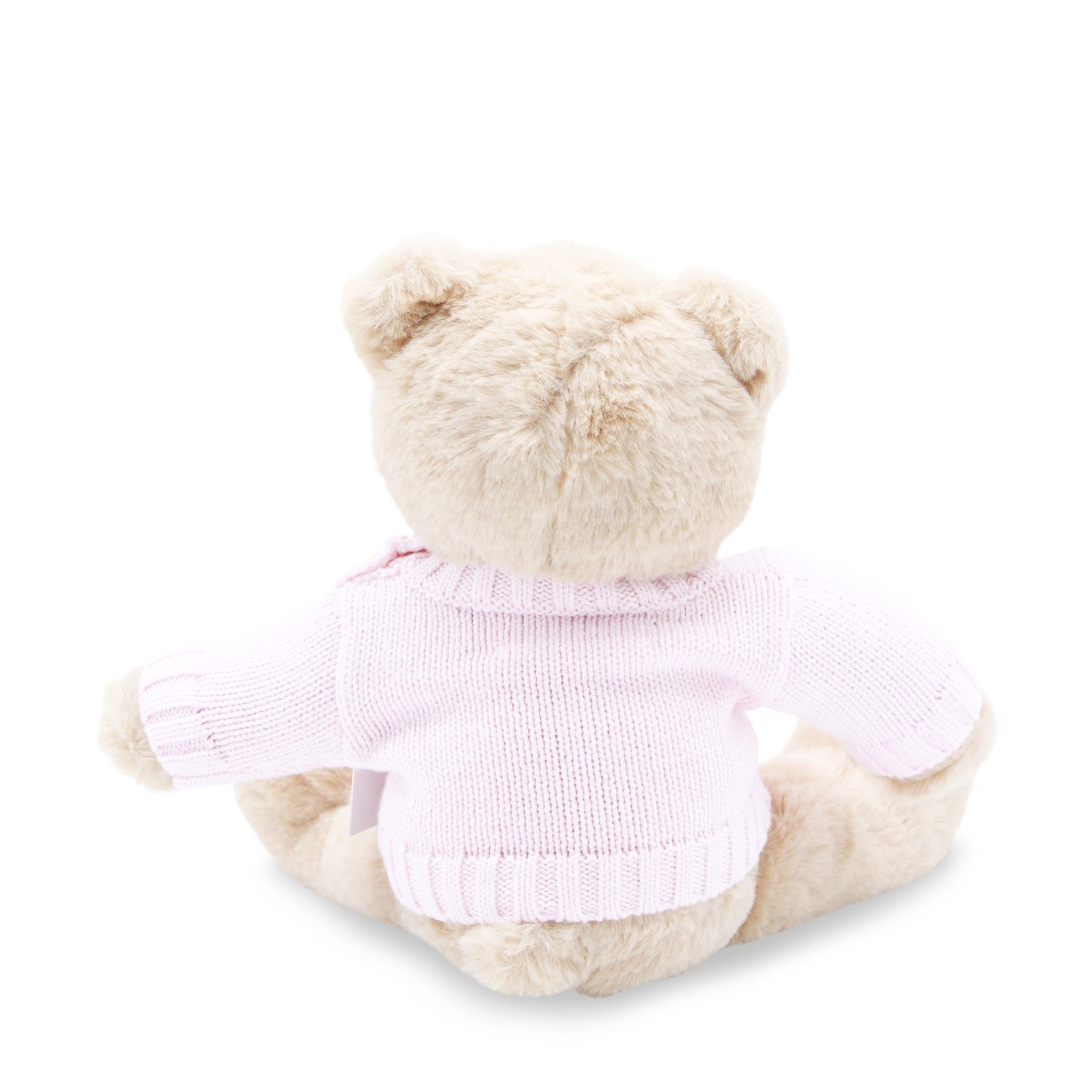 Acacia pink nursery from Polo Ralph Lauren featuring hairy teddy bear and pink sweatshirt.