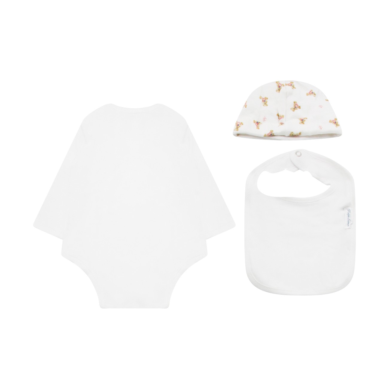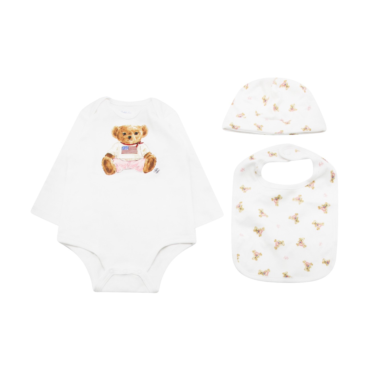 White and pink cotton nursery set from Polo Ralph Lauren featuring beanie, bib and bodysuit with long sleeves and frontal fastening.