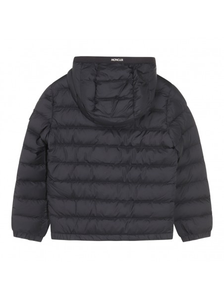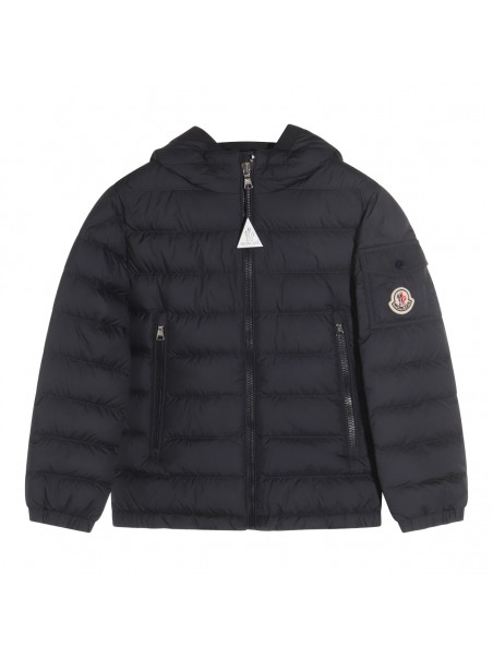Navy down jacket from Moncler featuring hood, long sleeves, zip fastening, elasticated cuffs, pockets and regular vestibility.