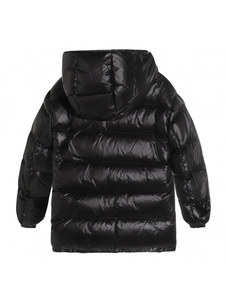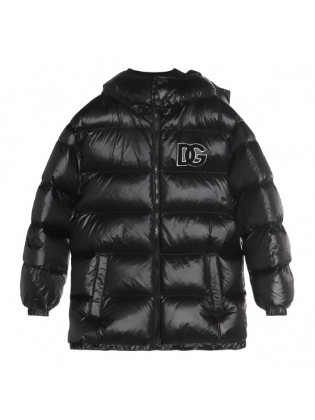 Black puffer down jacket from Dolce&Gabbana Kids featuring long sleeves, zip closure, hoodie, slash side zipped pockets and metal logo plaque at front.