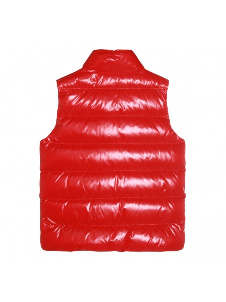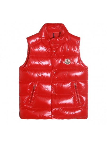 Red down jacket from Moncler featuring sleeveless, buttons fastening, pocket and logo patch.