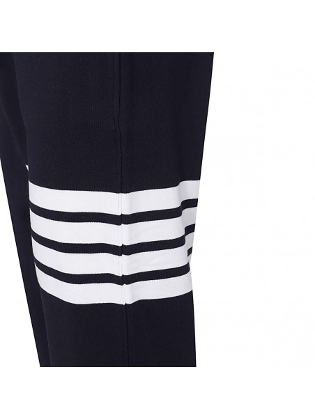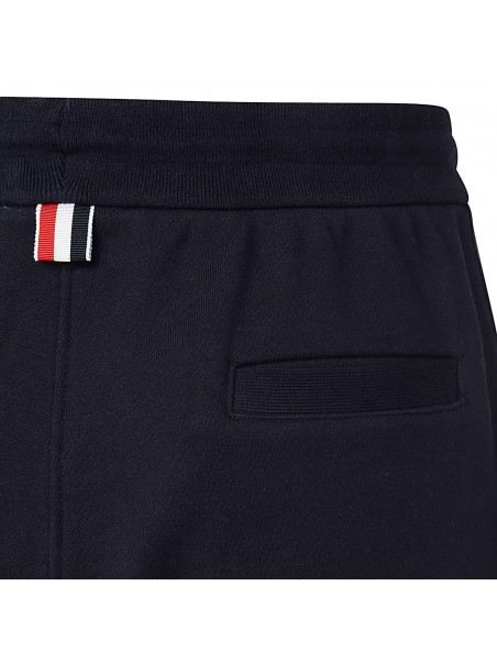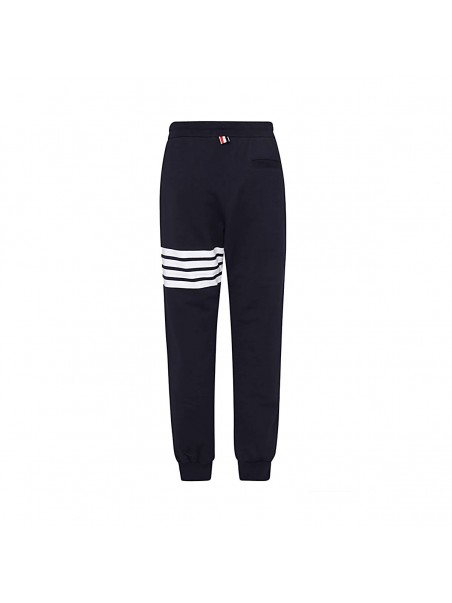 Navy blue cotton pants from Thom Browne featuring elasticizated waist with drawstrings, ribbed cuffs, lateral stripes and regular vestibility.