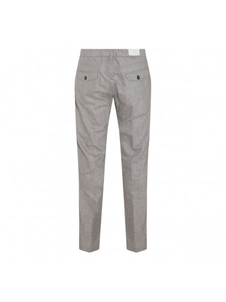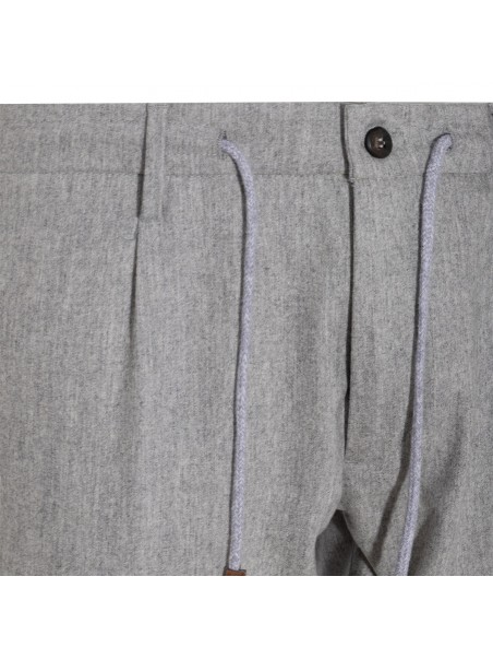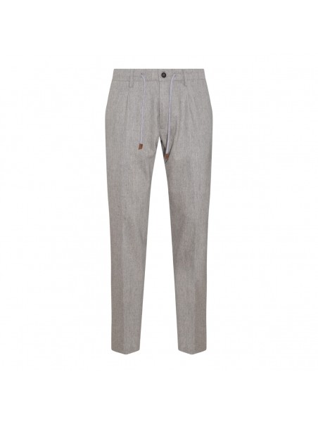Grey wool blend trousers from Eleventy featuring mange effect, elasticated drawstring waistband, front button and zip fastening, belt loops, two side slit pockets, two rear flap pockets, tapered leg and straight hem.