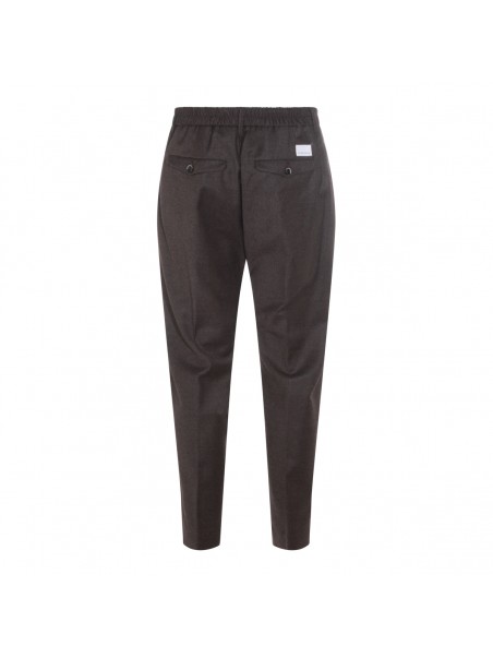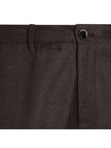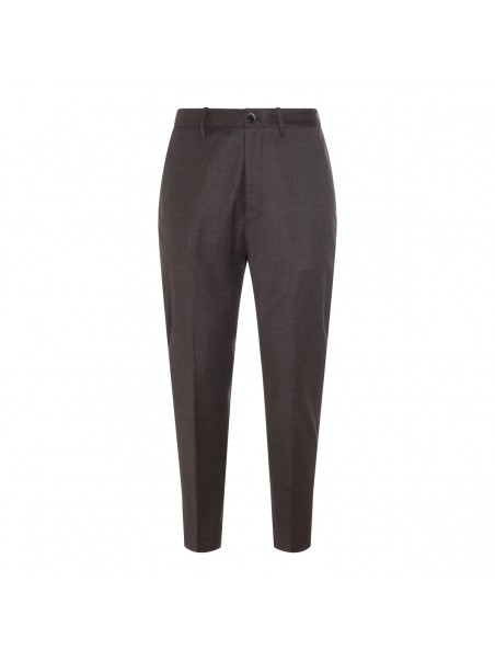Dark brown wool pants from Nine In The Morning featuring belt loops, semi elasticated waistband, zip and button fastening and straight leg.