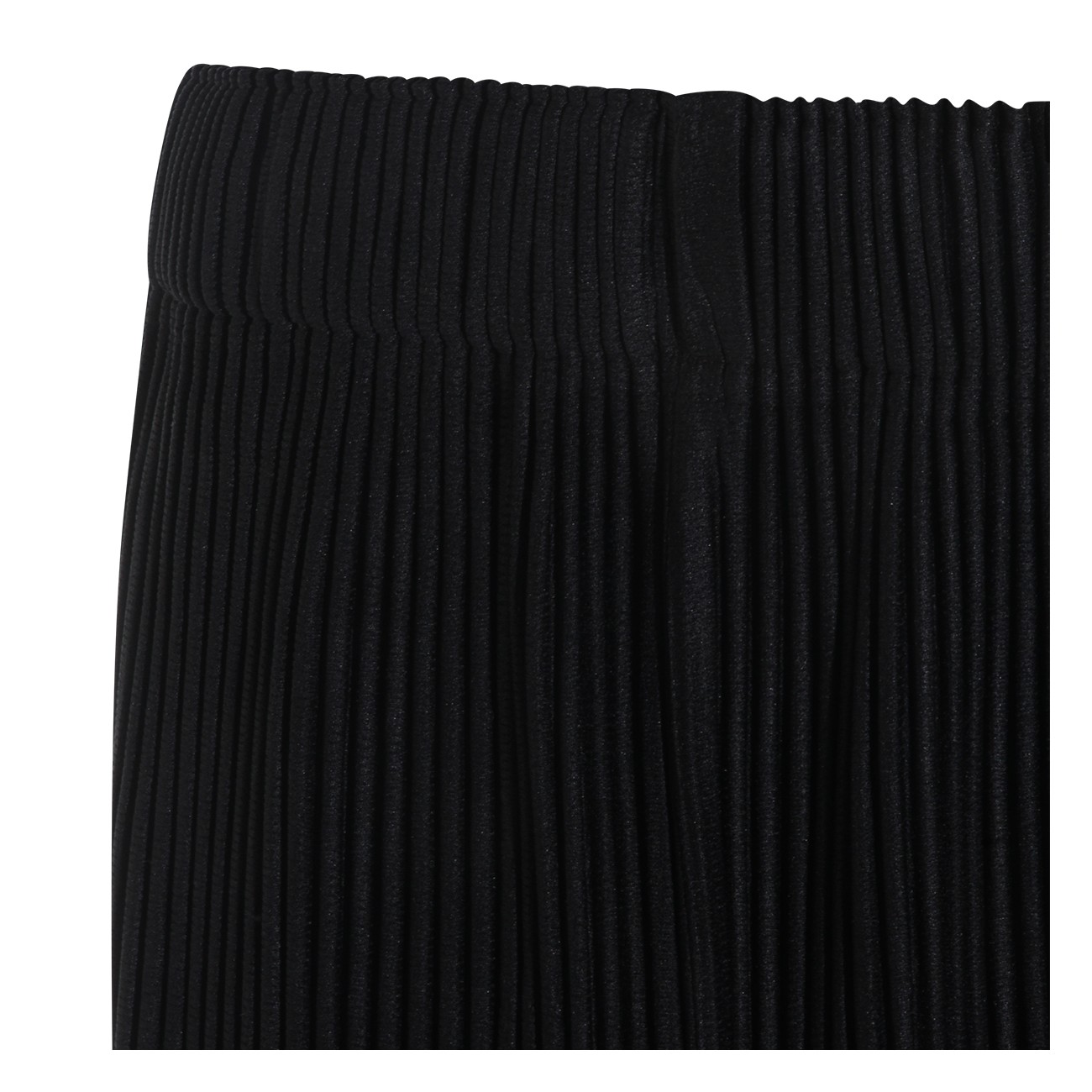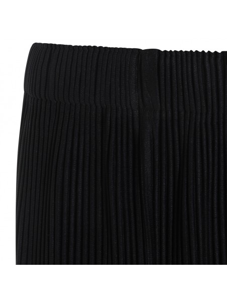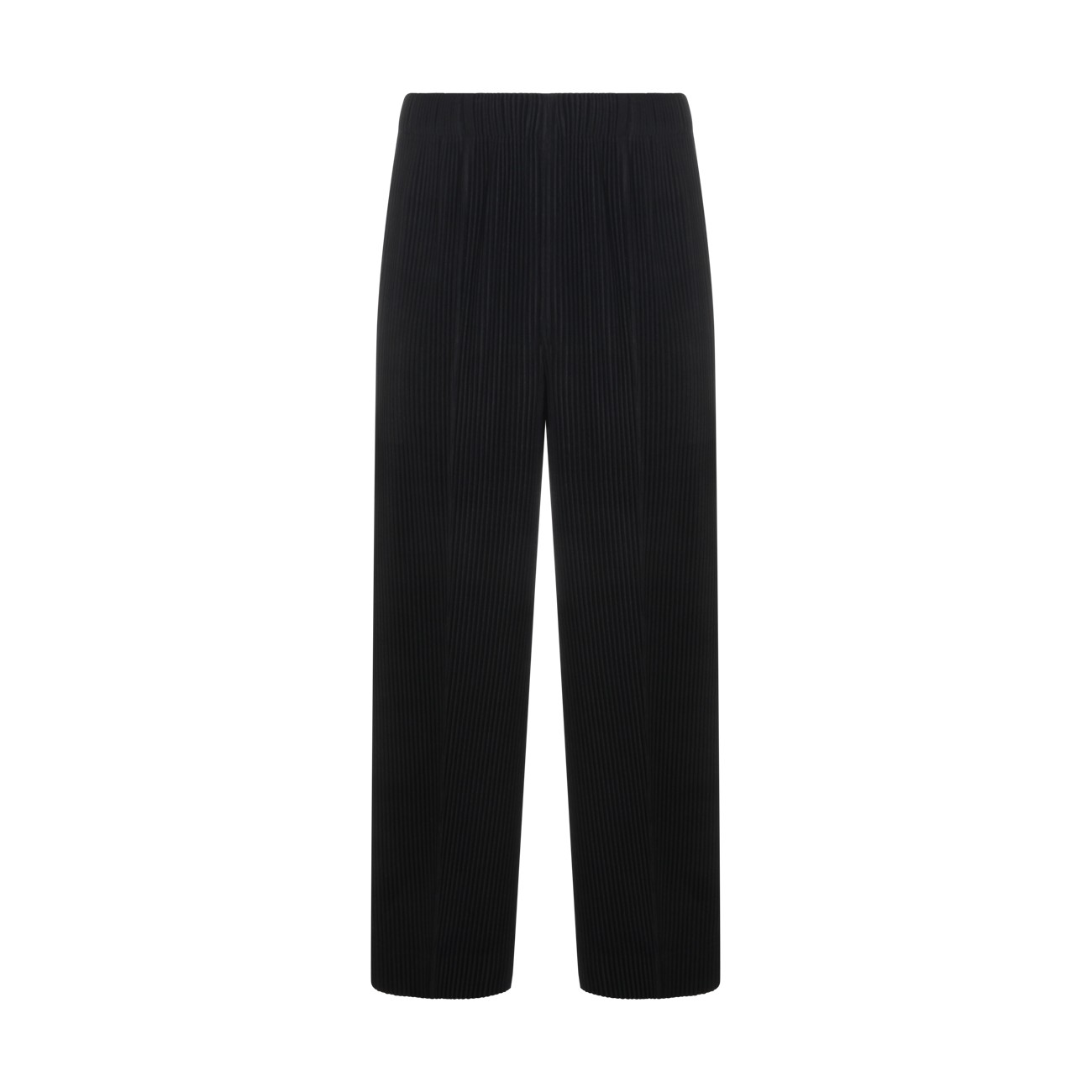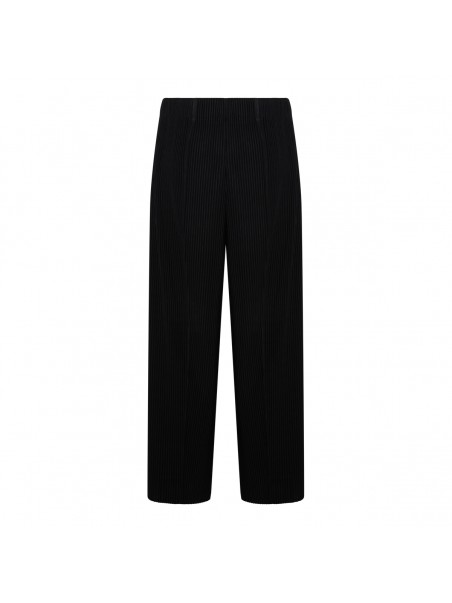 Black pleated pant from Homme Plisse Issey Miyake featuring stretched pleat, elastic with drawstring at the waist, flap with button, pockets and wide and straight leg.