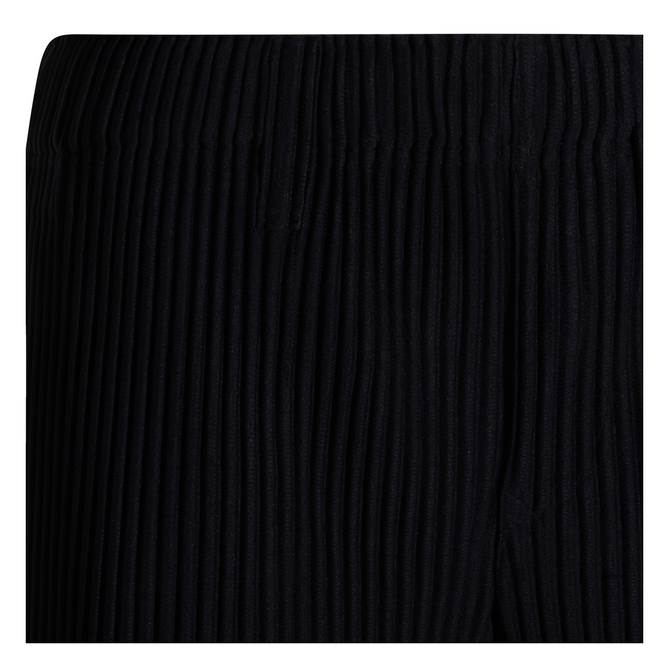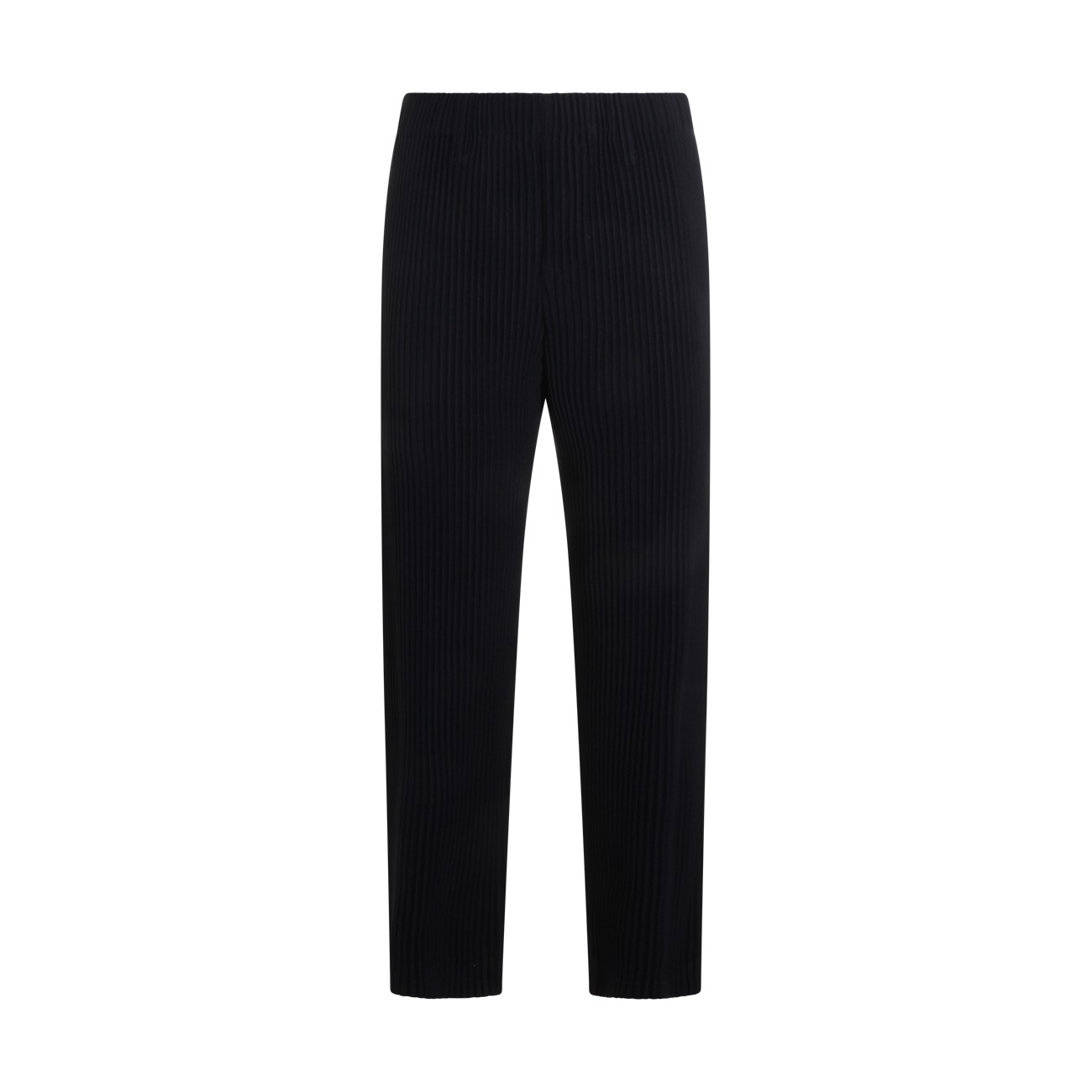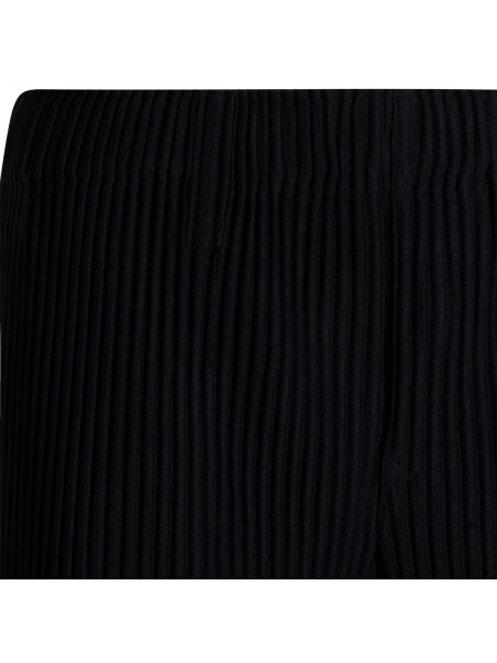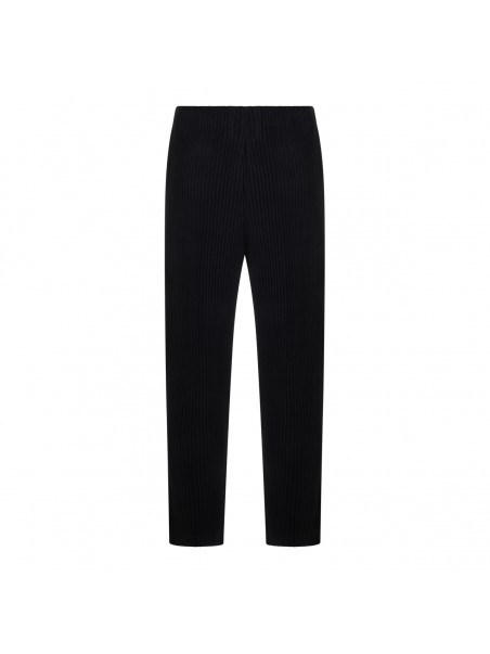 Navy pleated pant from Homme Plisse Issey Miyake featuring wide and straight leg, stretched pleat, elastic with drawstring at the waist, flap with button and pockets.