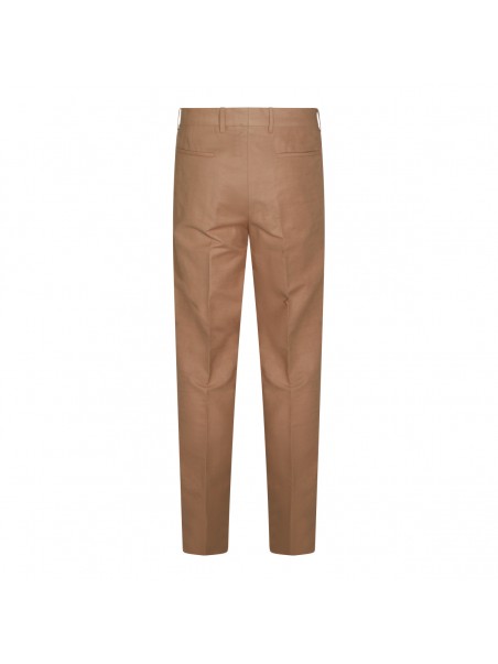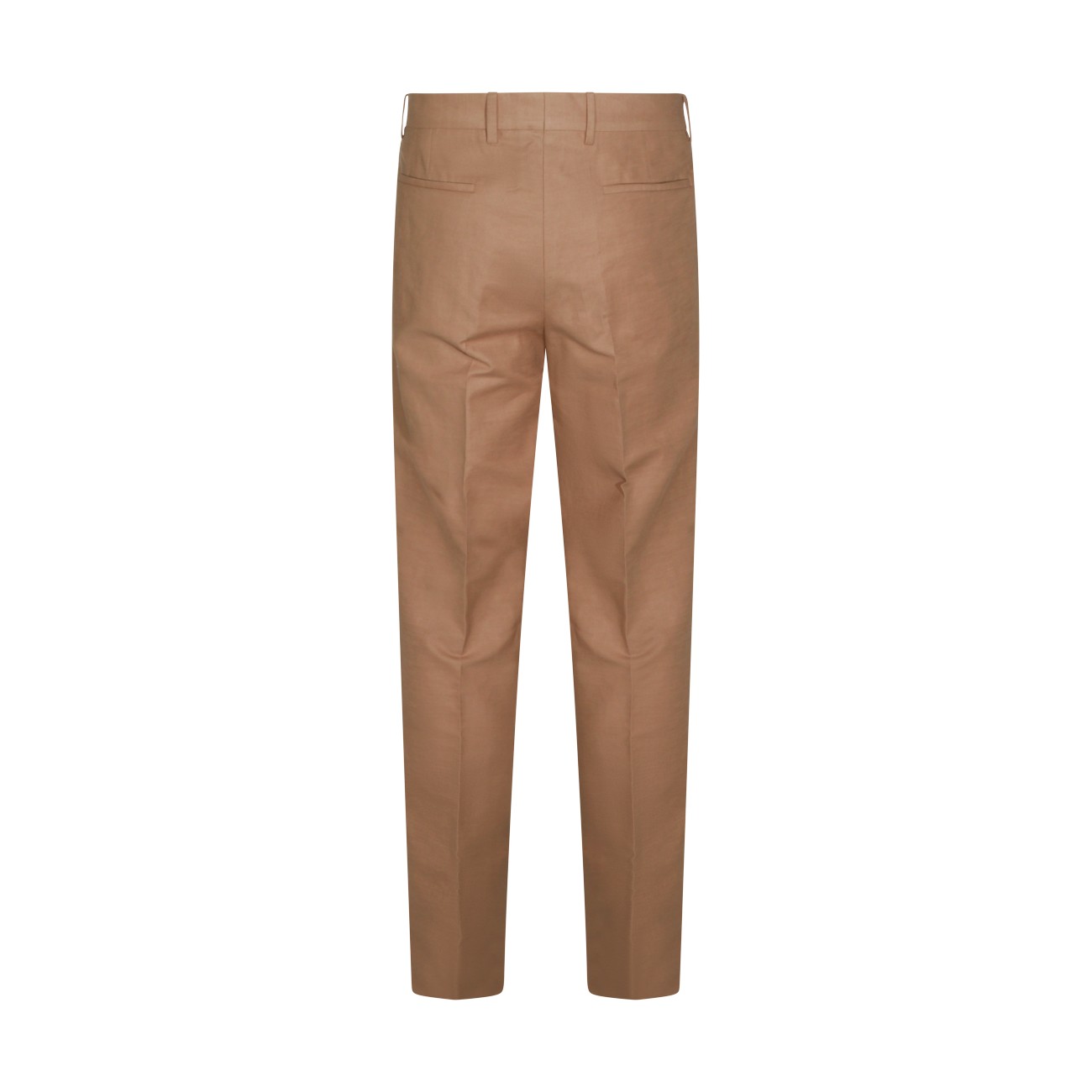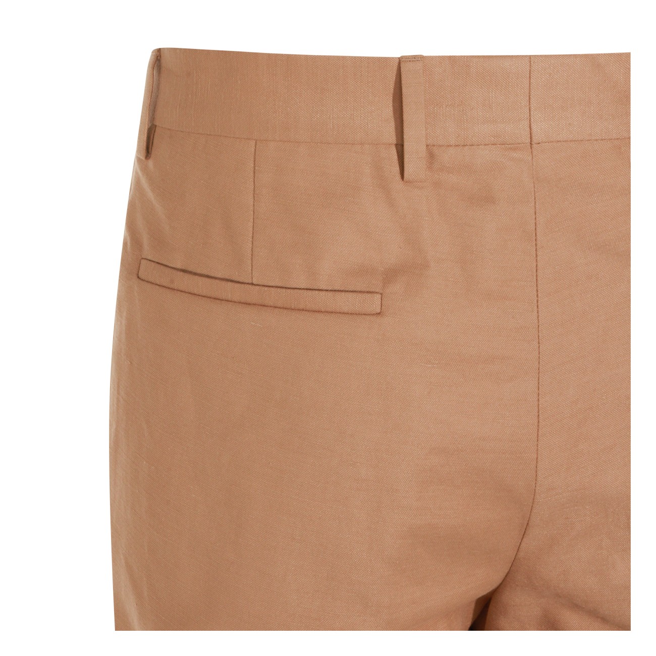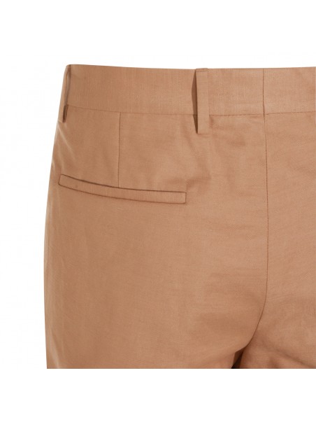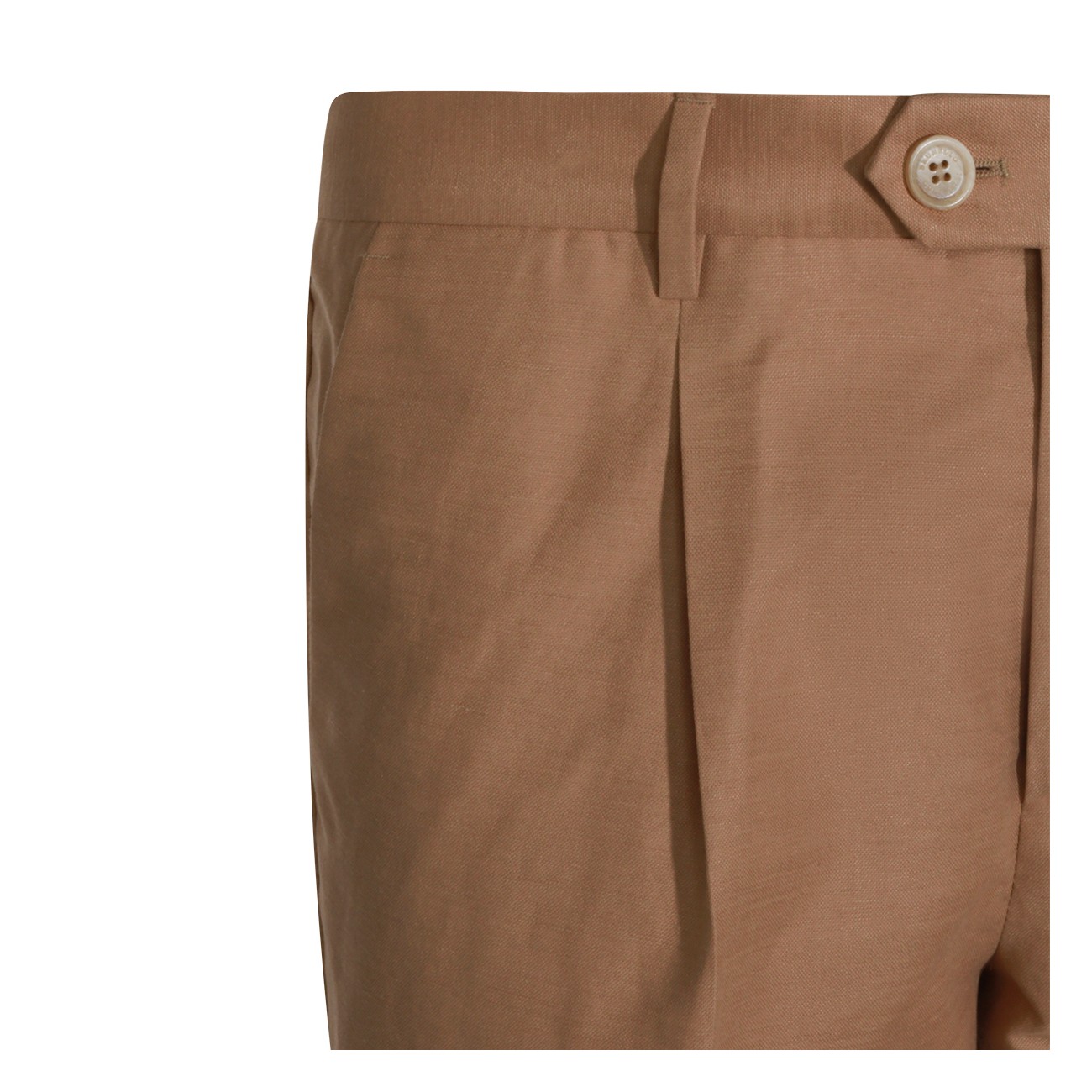 Caramel cotton and linen blend pants from Brunello Cucinelli featuring straight leg, side pockets, zip closure fastening, button closure and belted waist.