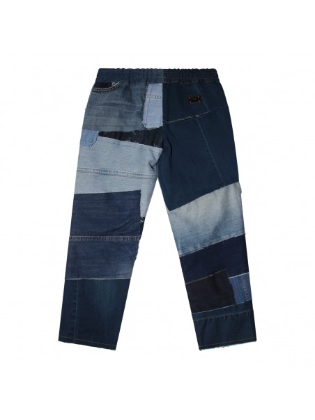 Denim patchwork joggings pants from Docle&Gabbana Kids featuring elasticated waistband, side pockets, logo plaque at back, back pocket and all over patchwork denim inserts.