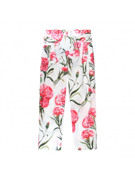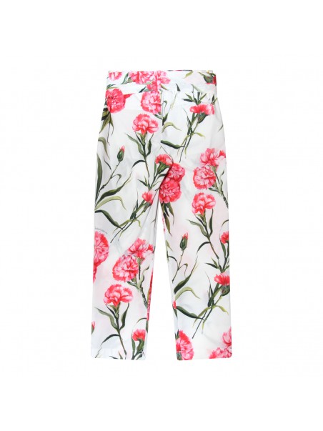 White and red cotton Carnation pants from Dolce&Gabbana Kids featuring concealed zip closure, side pockets, highwaist, straight leg and all over Carnation print.