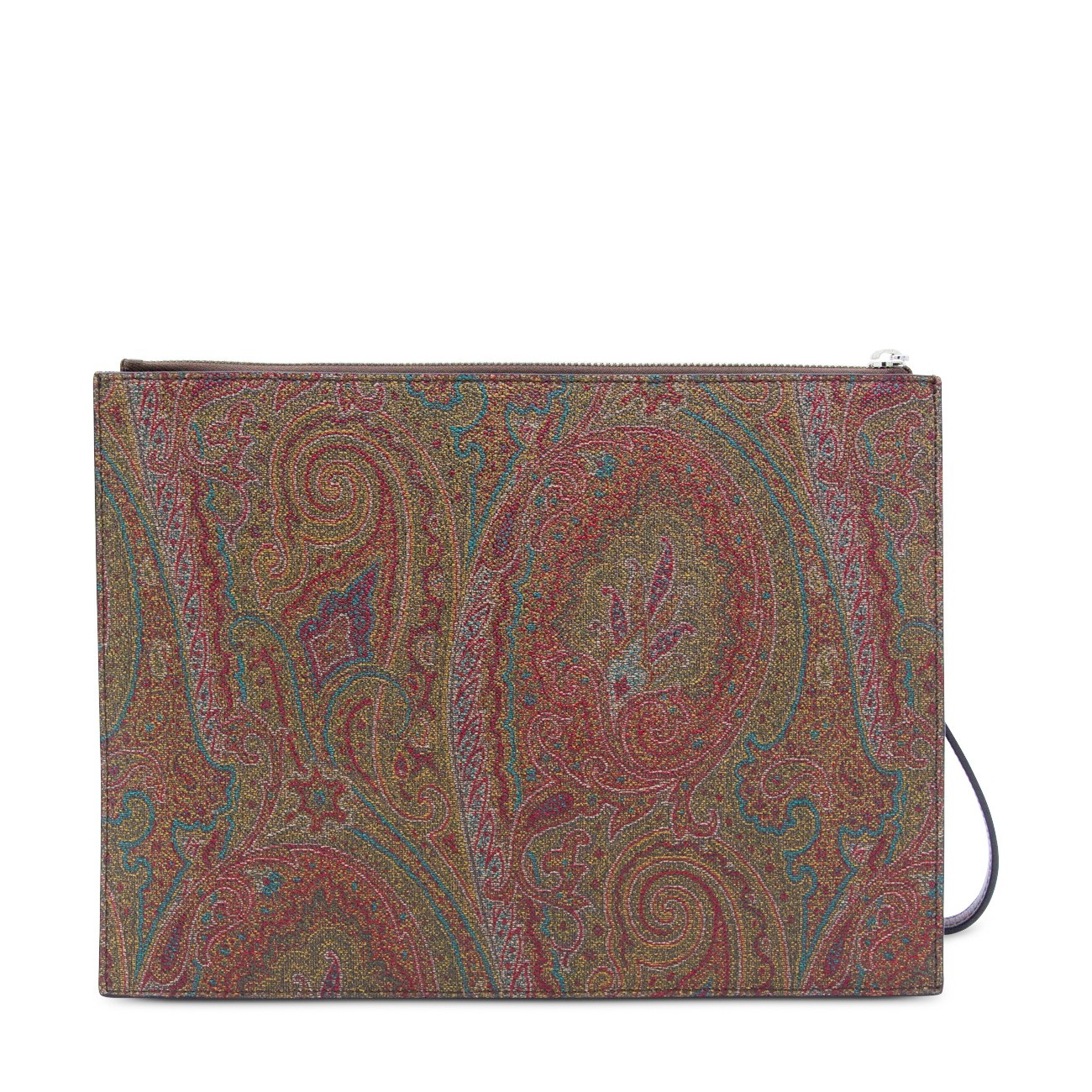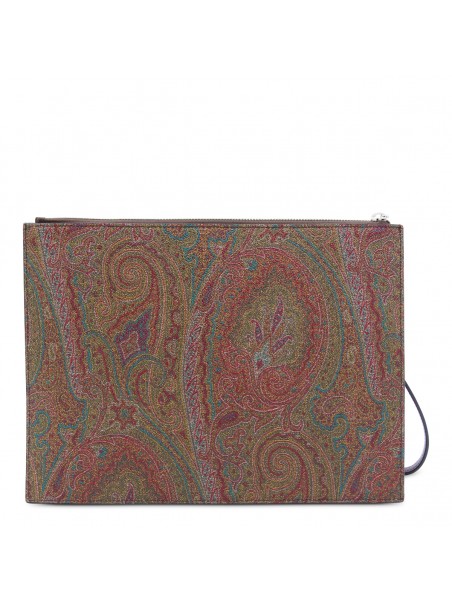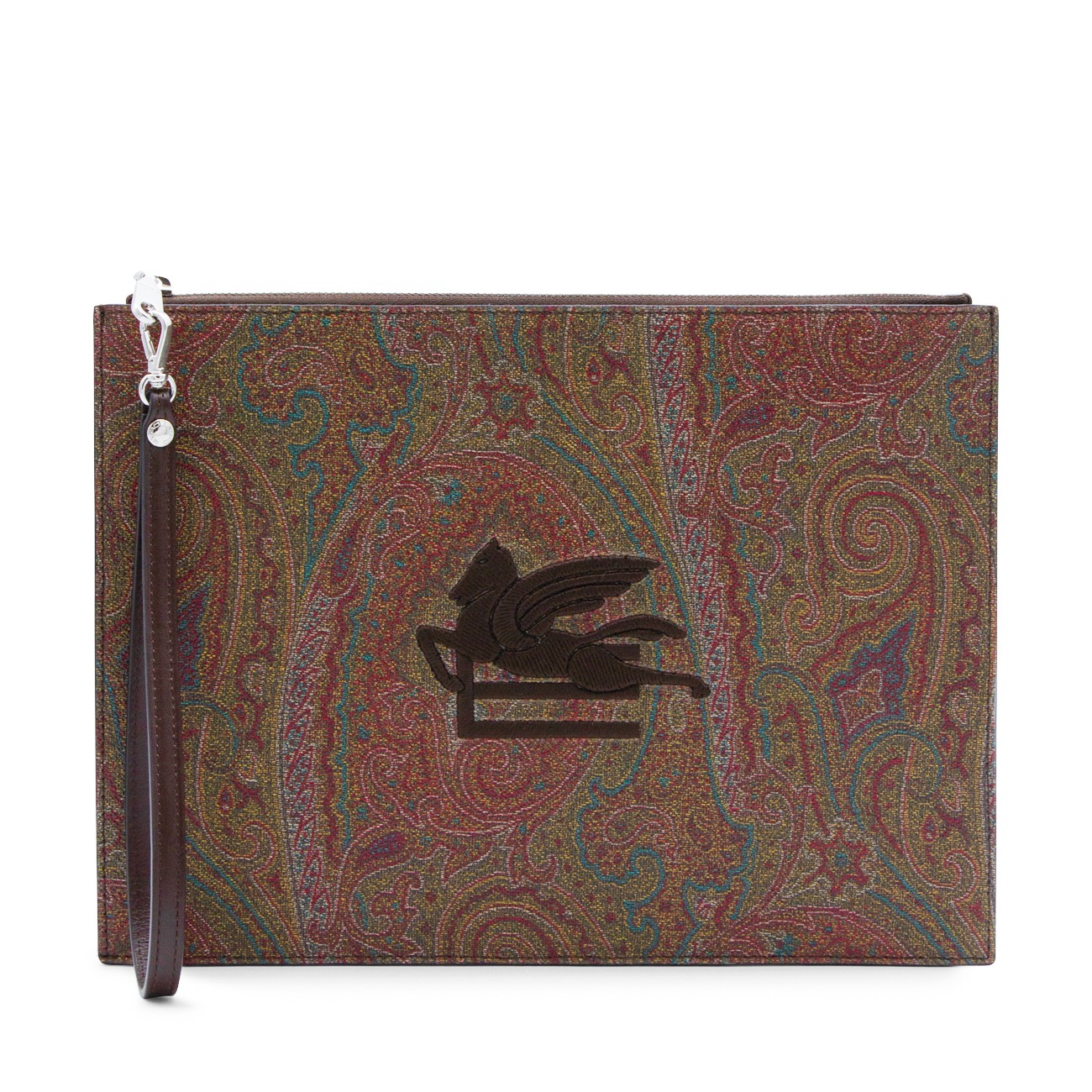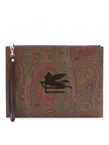 Paisley zipped pouche from Etro featuring zipped closure, all over Paisley motif, silver tone metal hardware and main compartment.