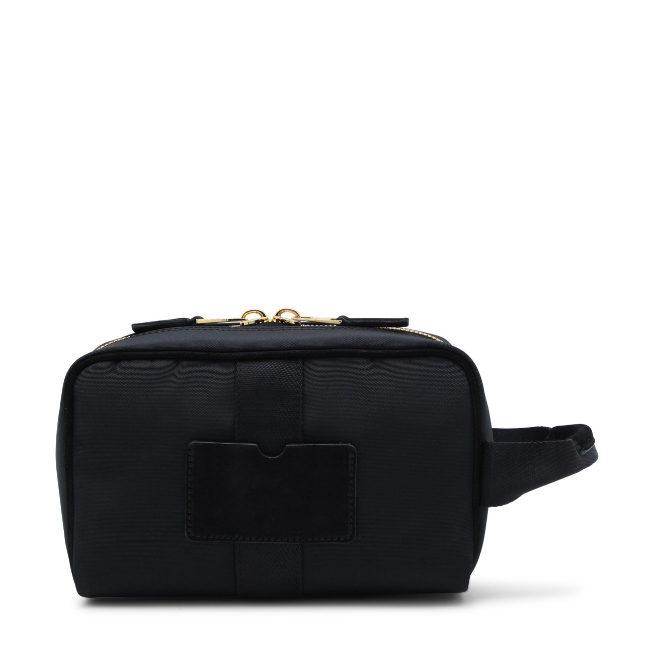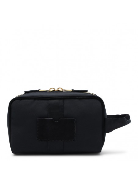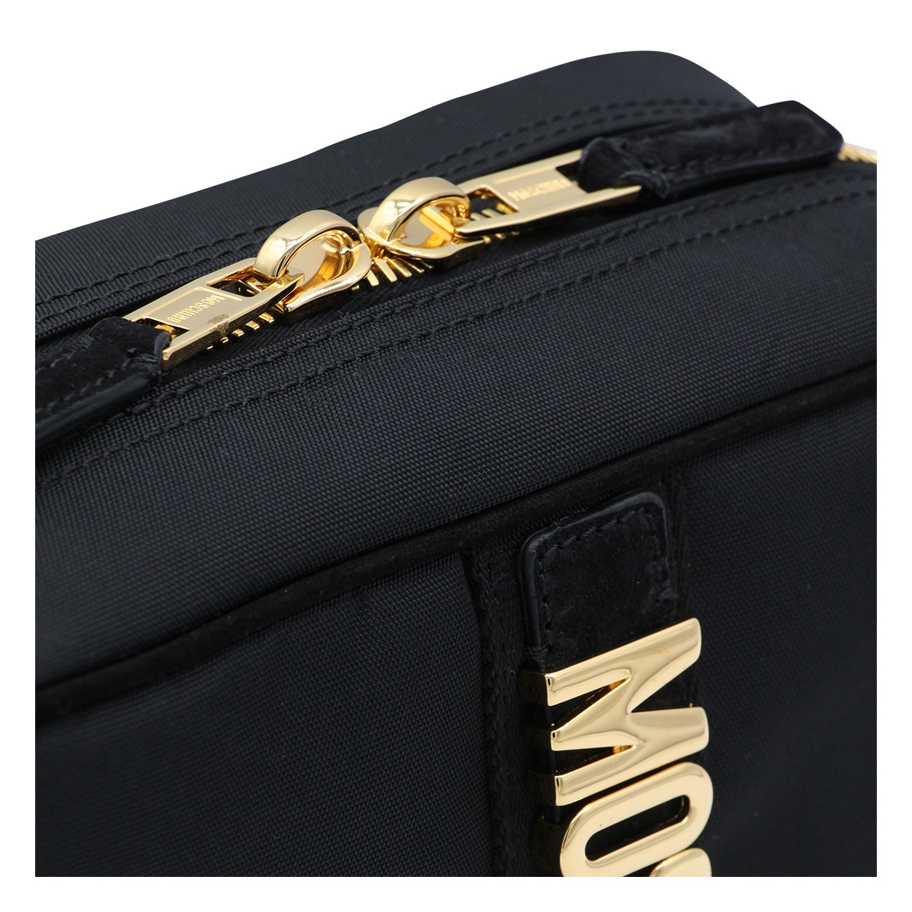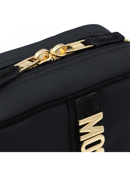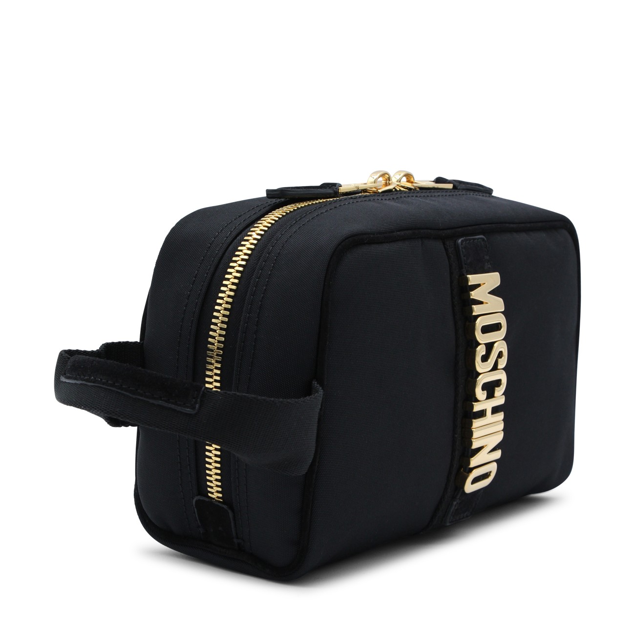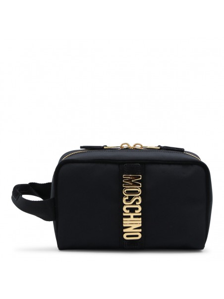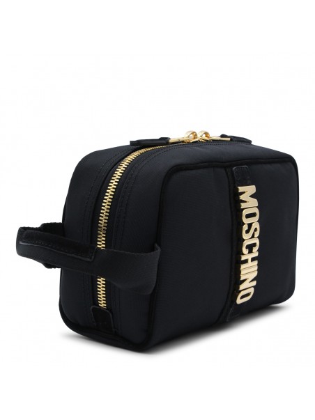 Black leather pouches from Moschino featuring upper zip fastening, lateral gold logo and lateral handle.