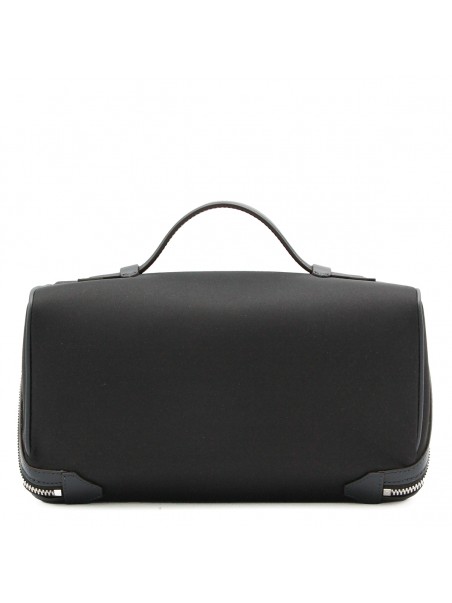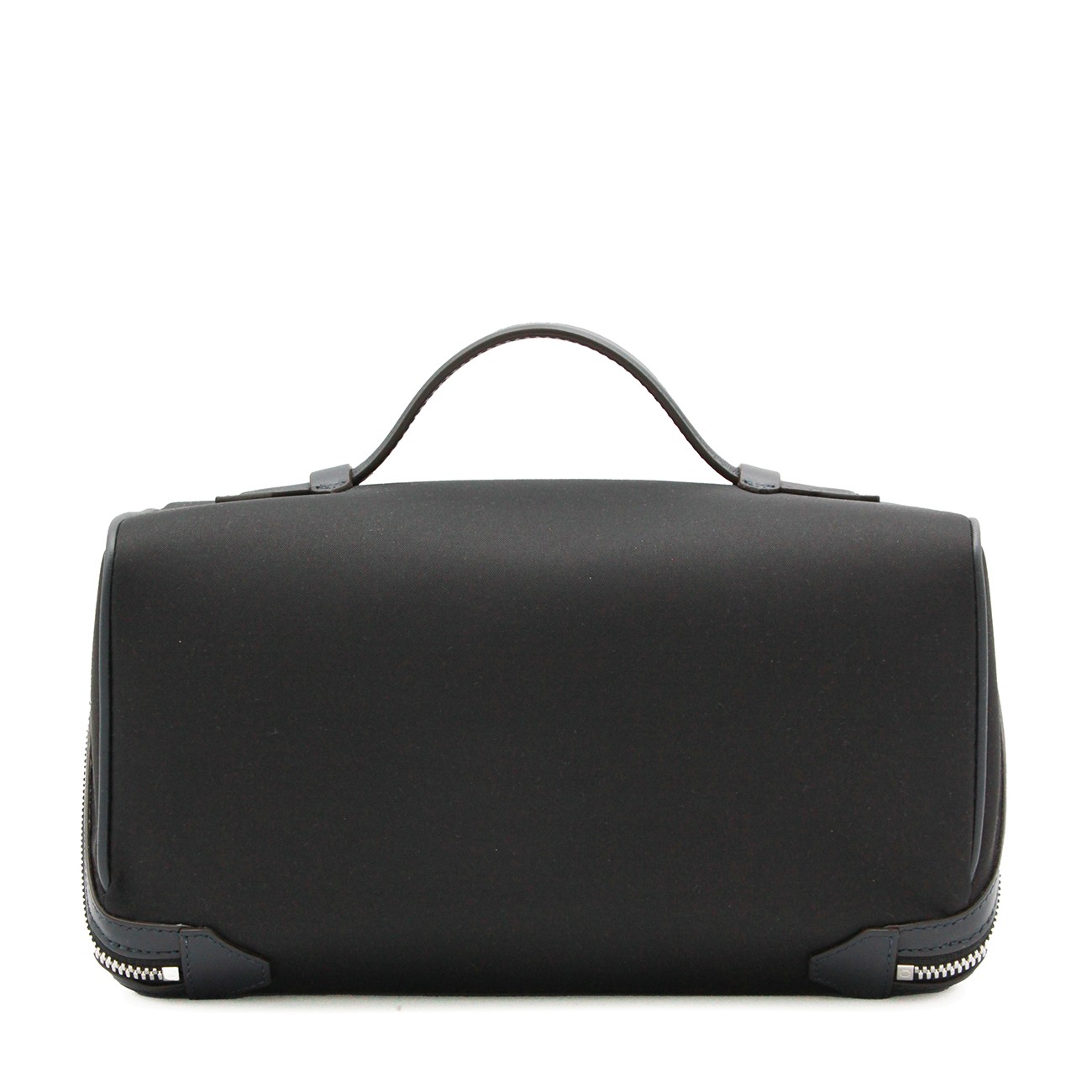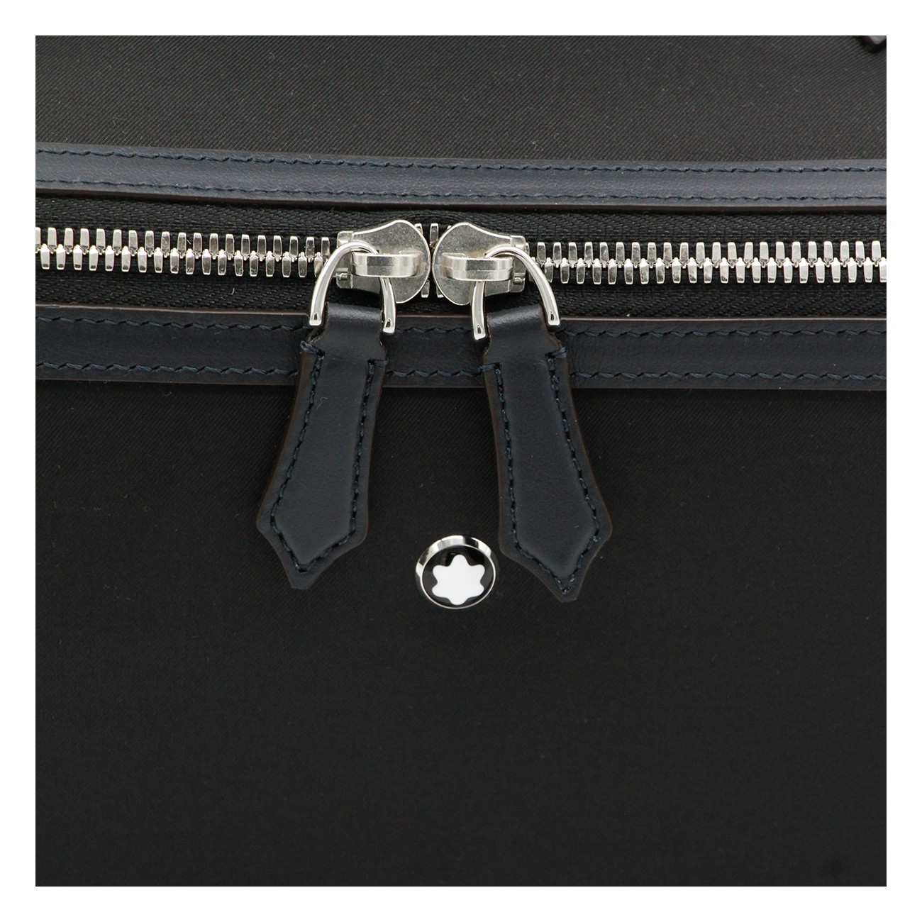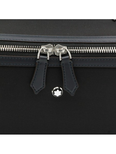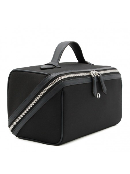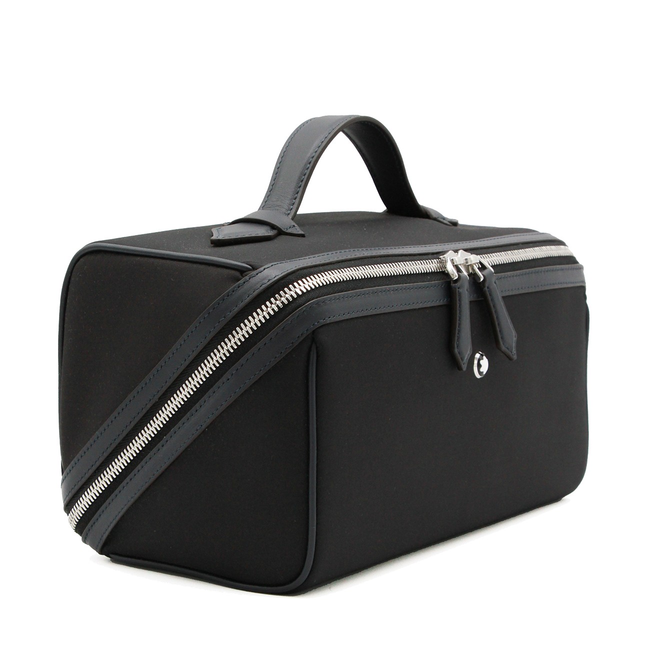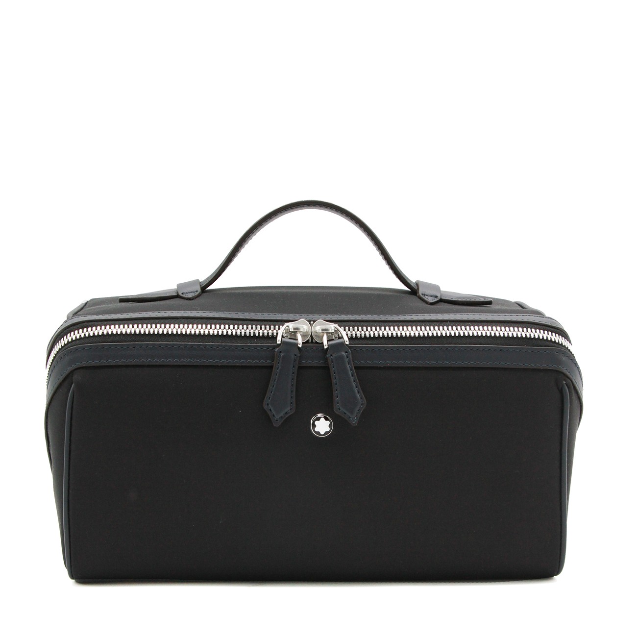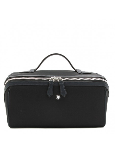 Black leather pouch from Montblanc featuring rectangular shape, logo, top handle, double zip fastening and main compartment.